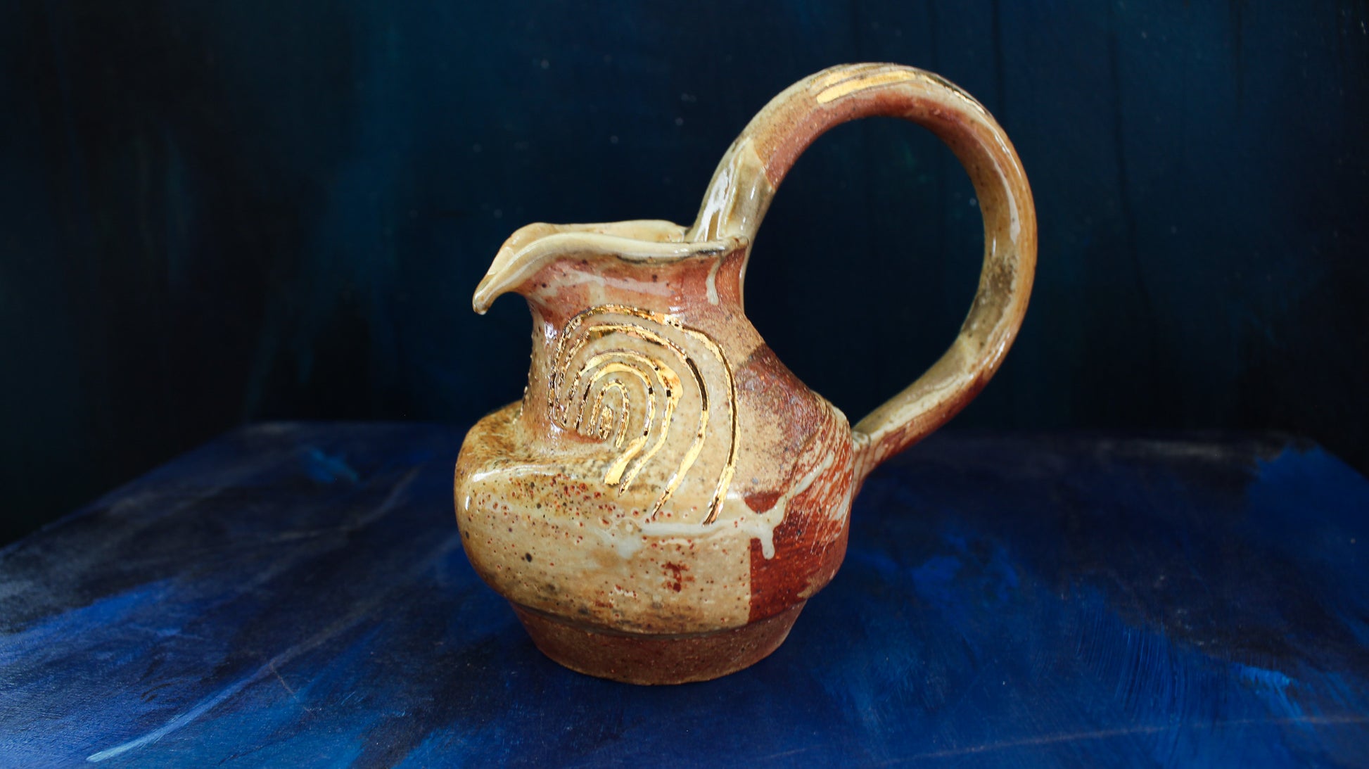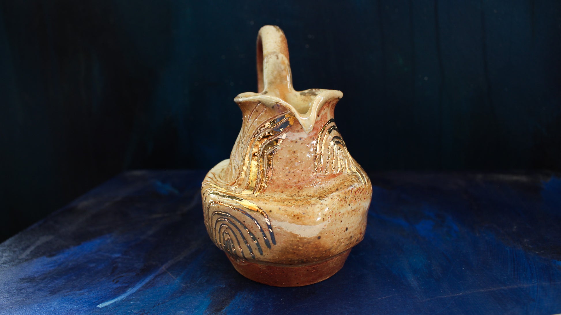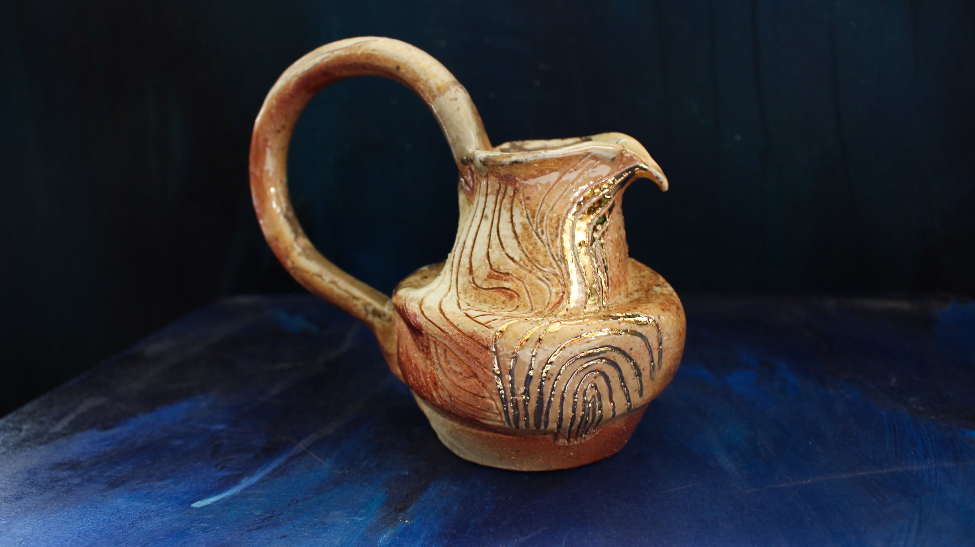 This Golden Pitcher is individually thrown, painted, carved, glazed & embellished with gold luster from start to finish as a one of a kind piece. It is fired in a wood fired kiln which creates unrepeatable results every time, caused by the wood ash, flashing of the flame & reduction atmosphere.
