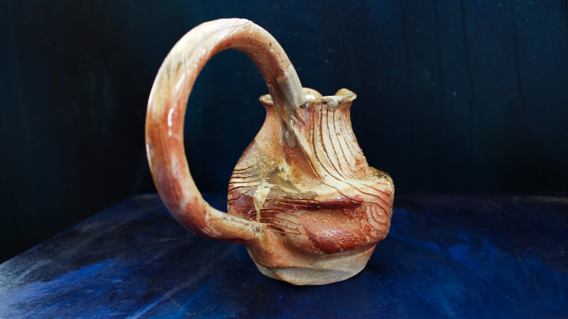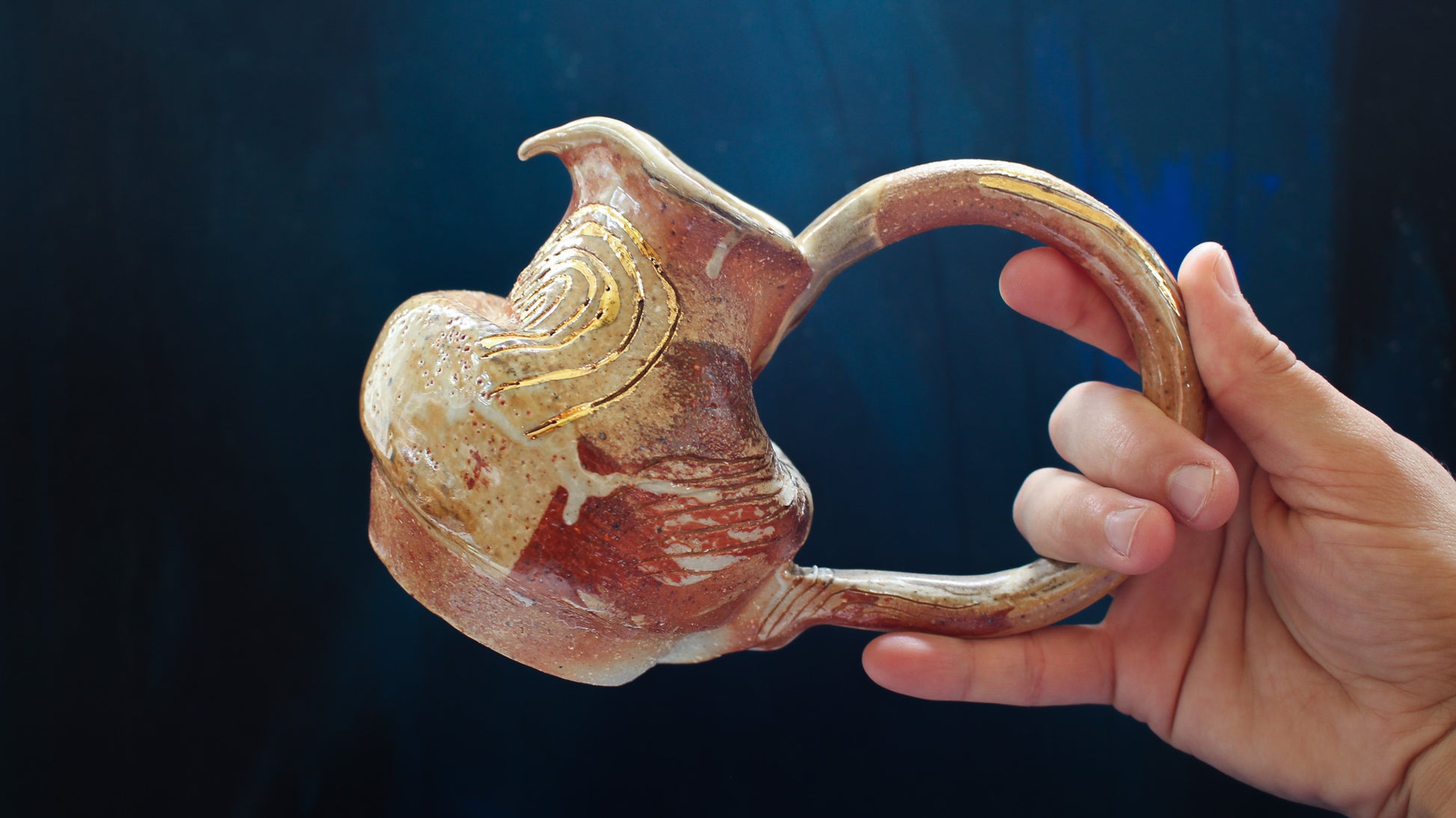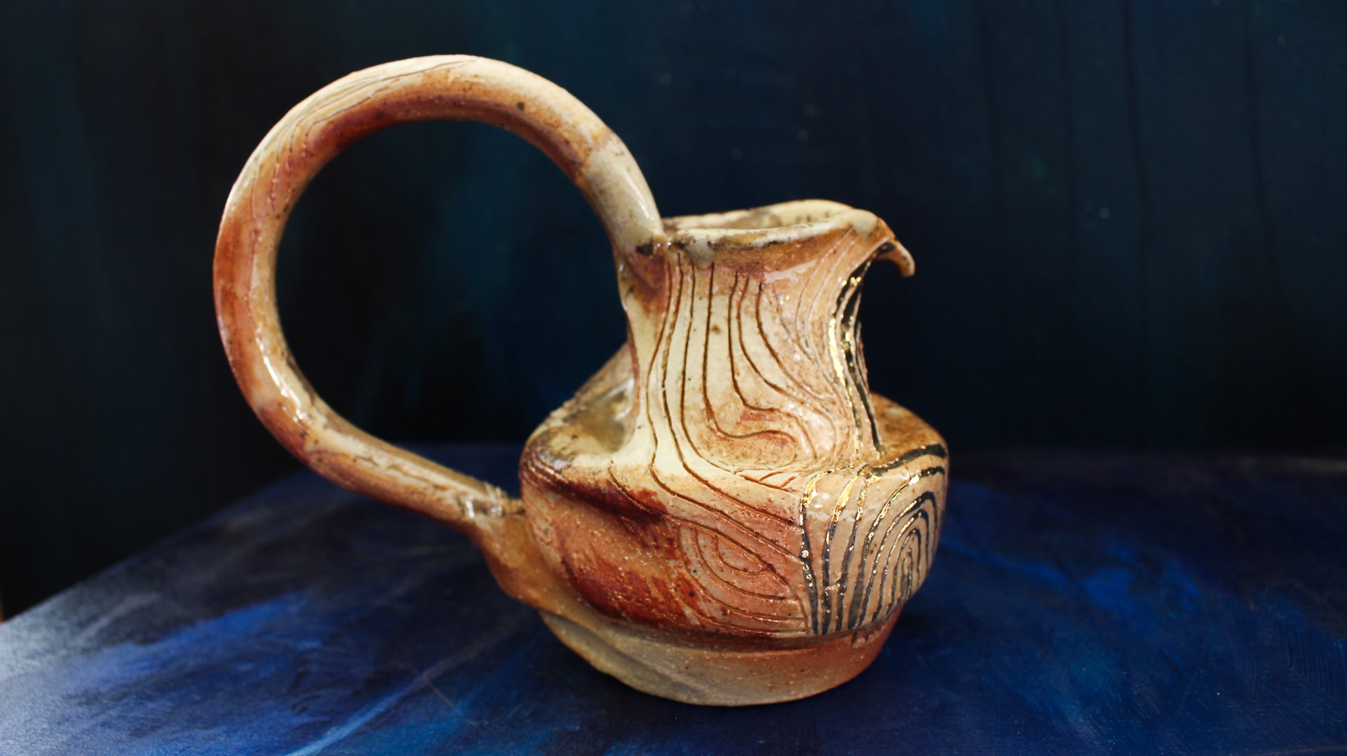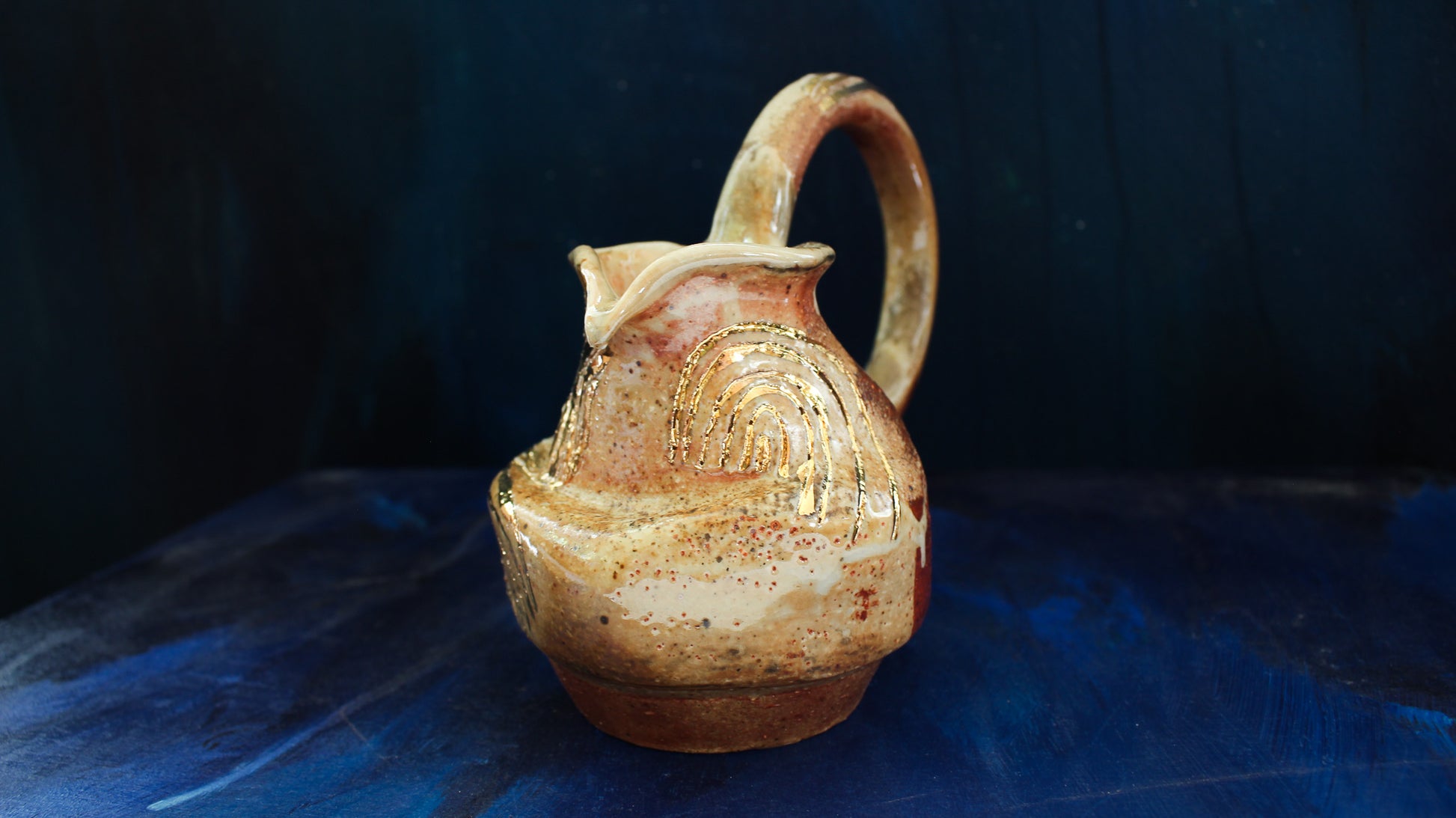 This Golden Pitcher is individually thrown, painted, carved, glazed & embellished with gold luster from start to finish as a one of a kind piece. It is fired in a wood fired kiln which creates unrepeatable results every time, caused by the wood ash, flashing of the flame & reduction atmosphere.
