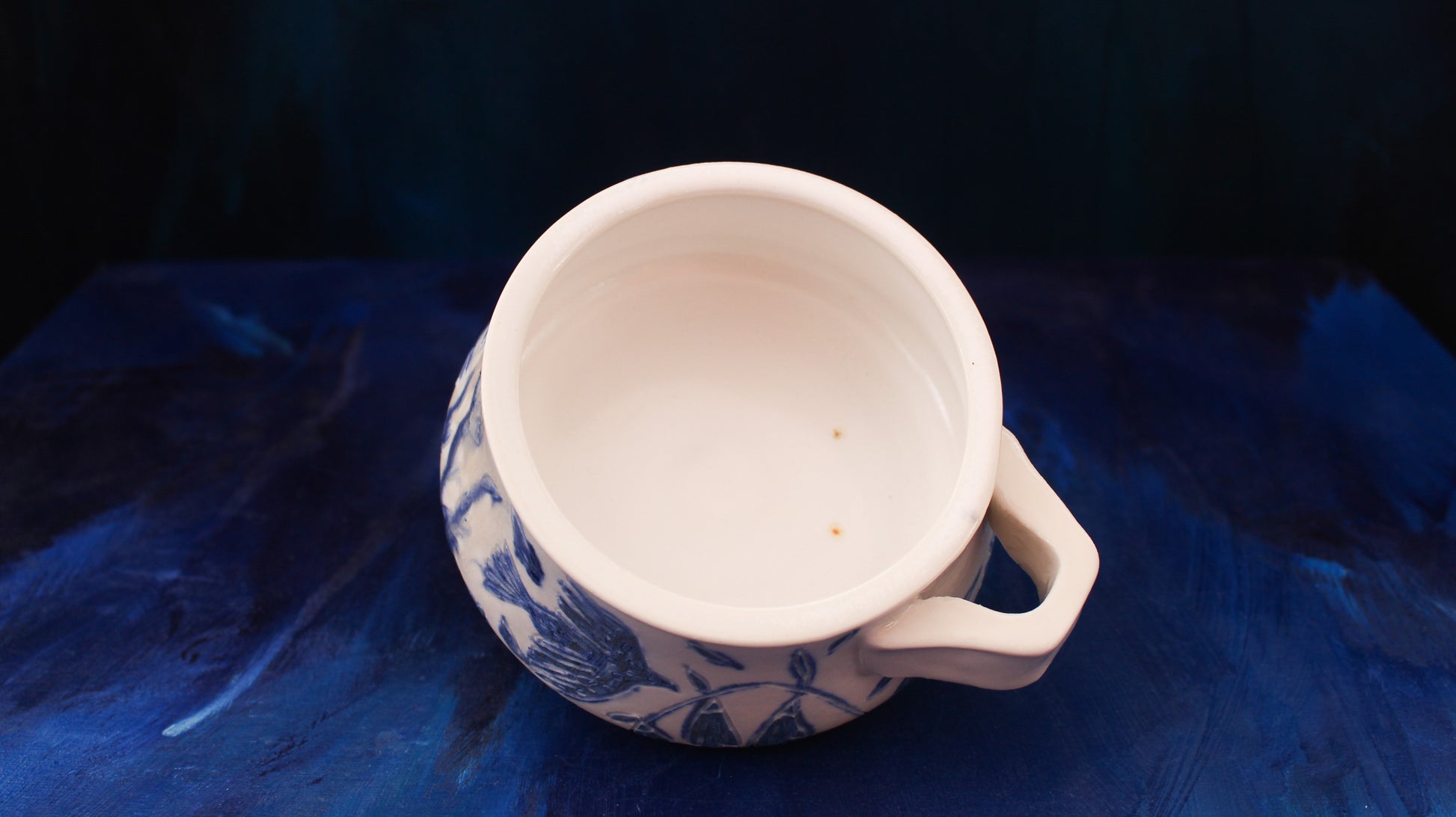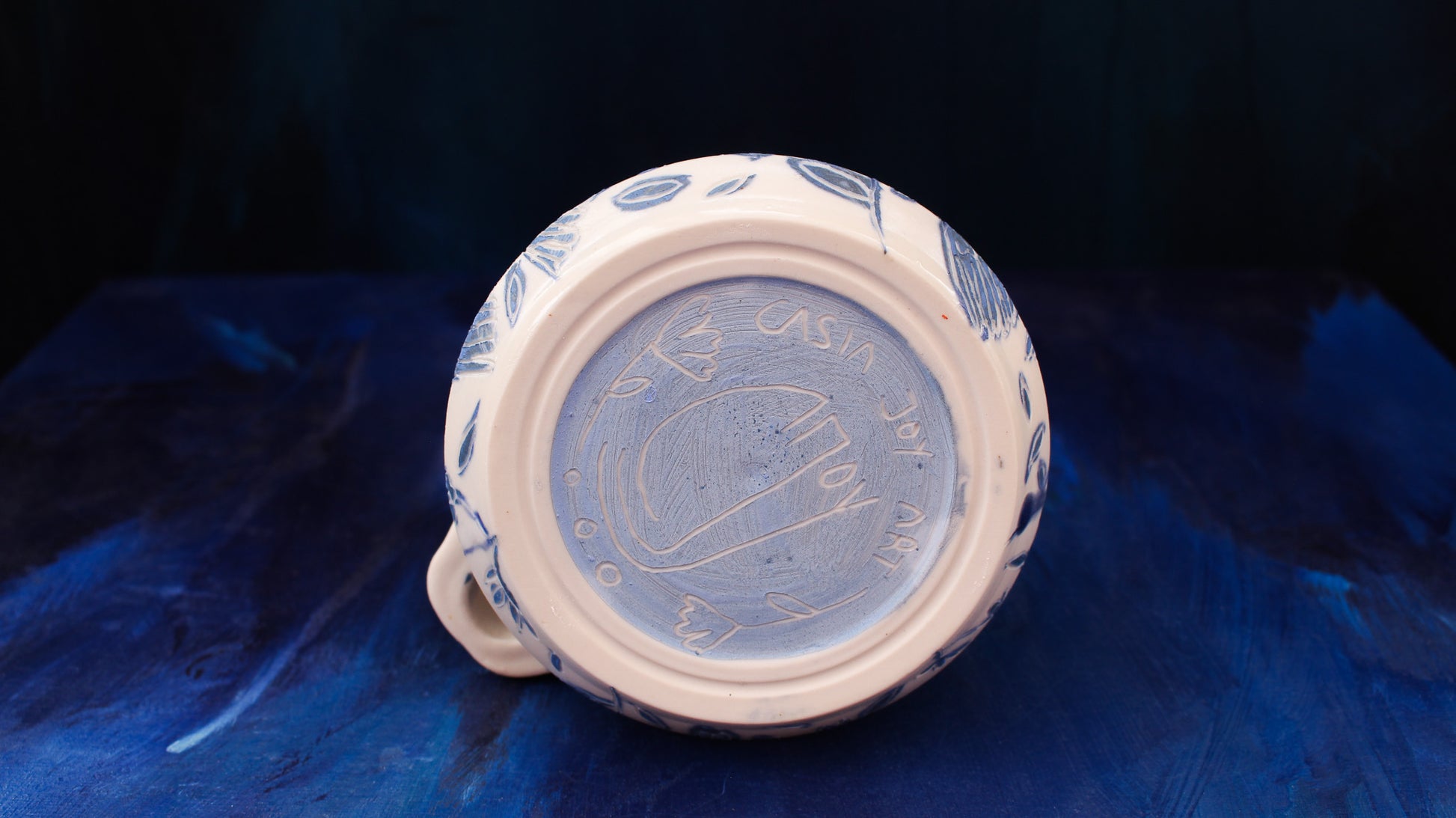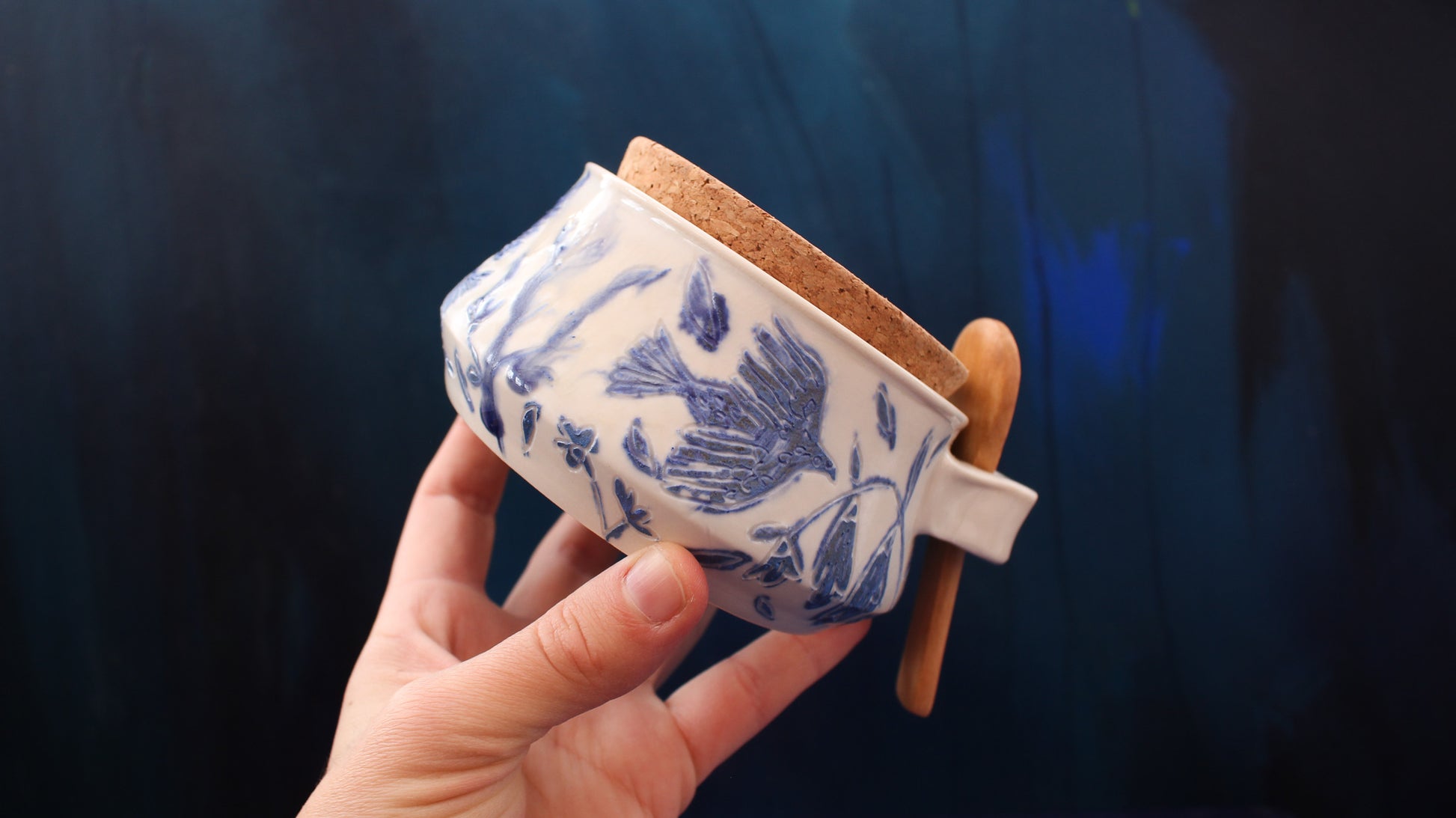 This porcelain cellar is individually thrown, painted, carved, & glazed from start to finish as a one of a kind piece. It is fired in a wood fired kiln which creates unrepeatable results every time, caused by the wood ash, flashing of the flame & reduction atmosphere.