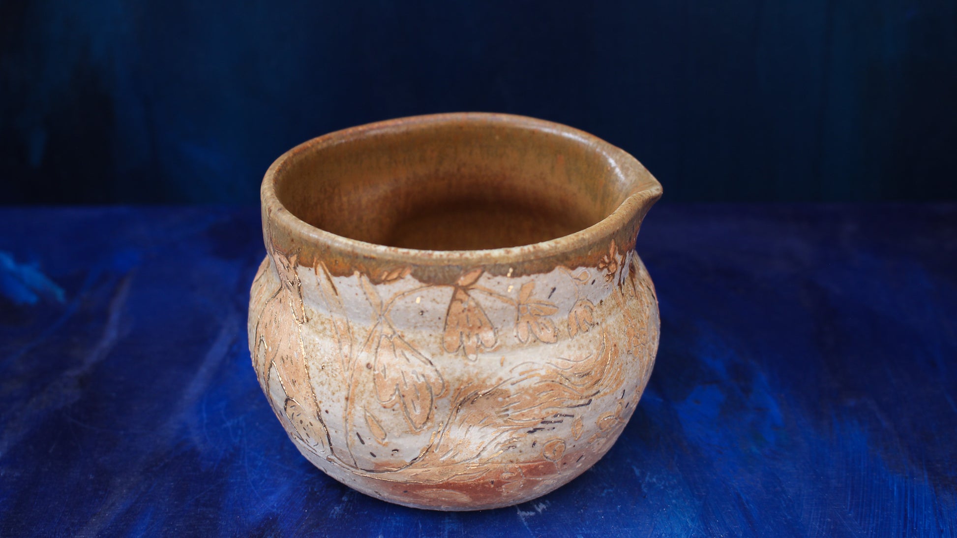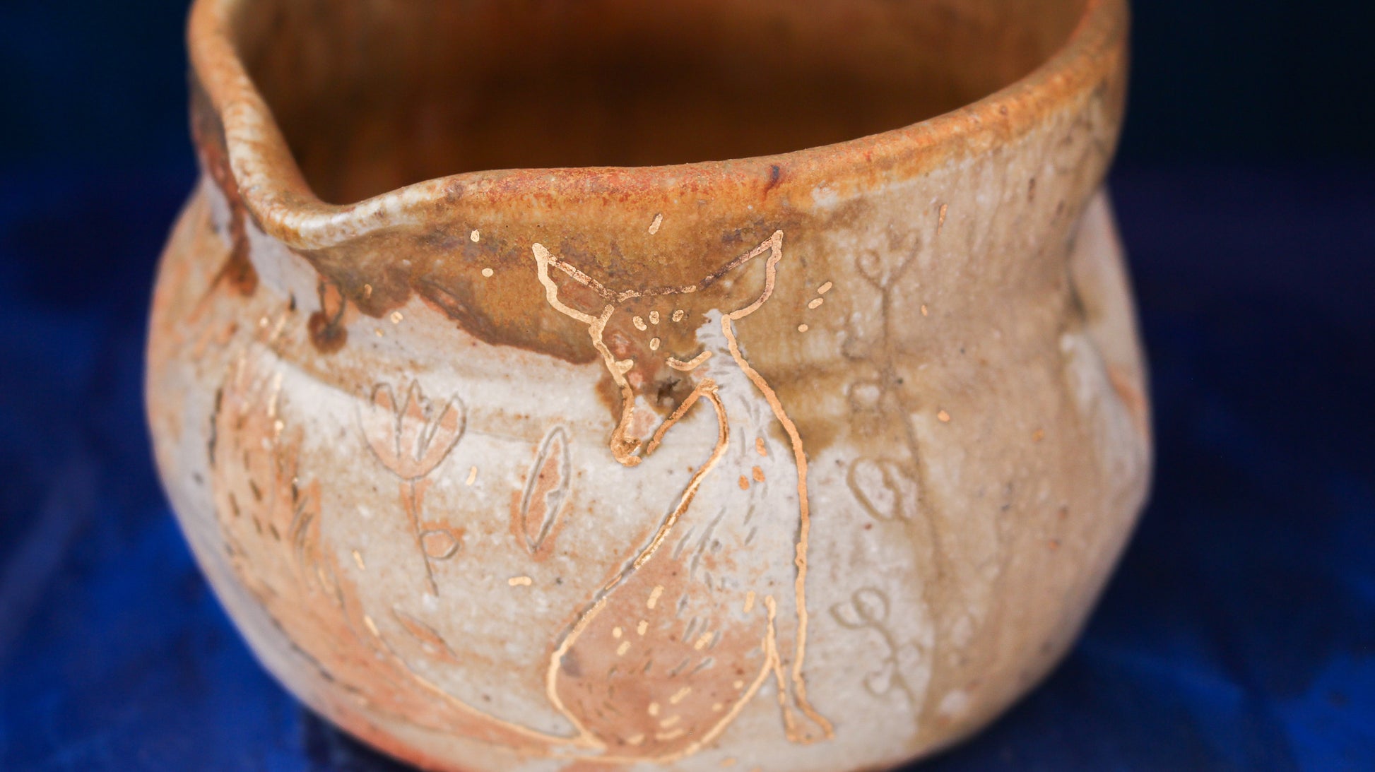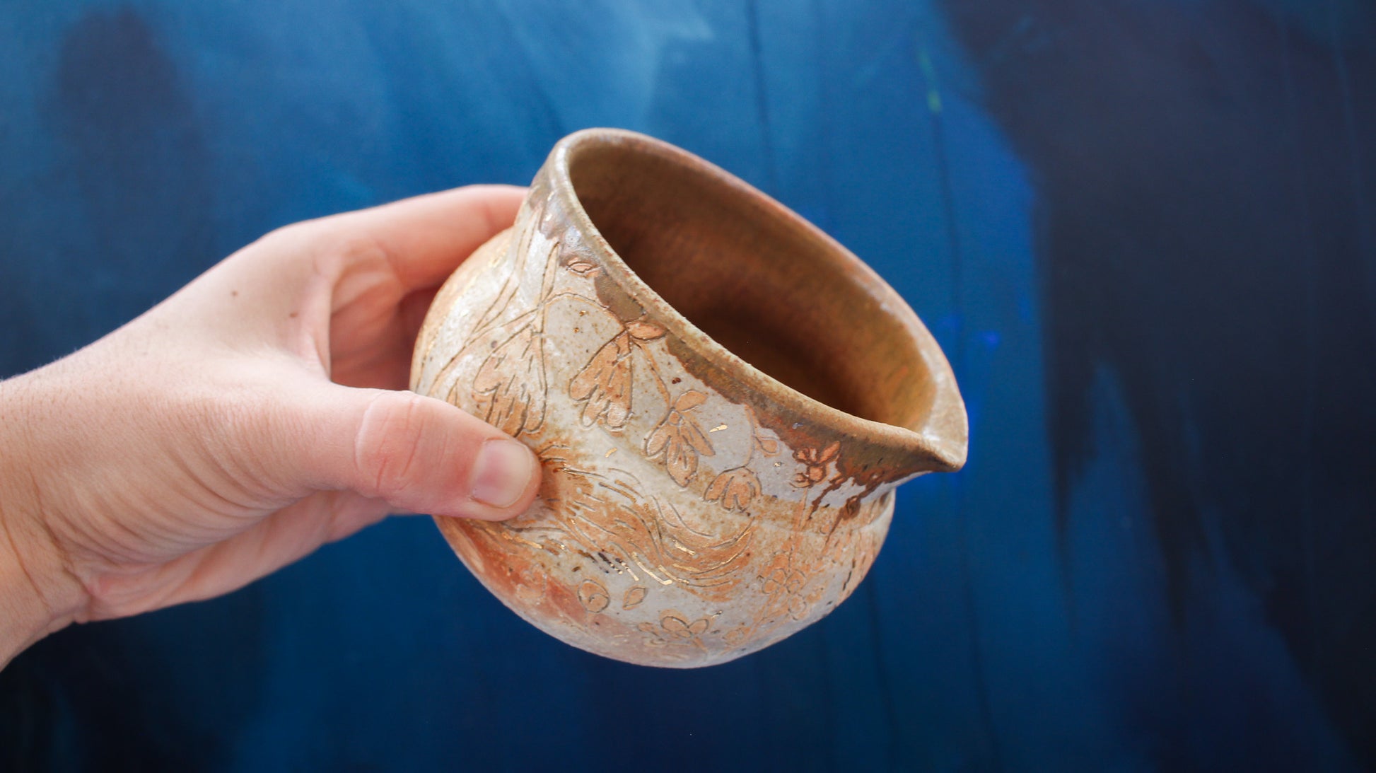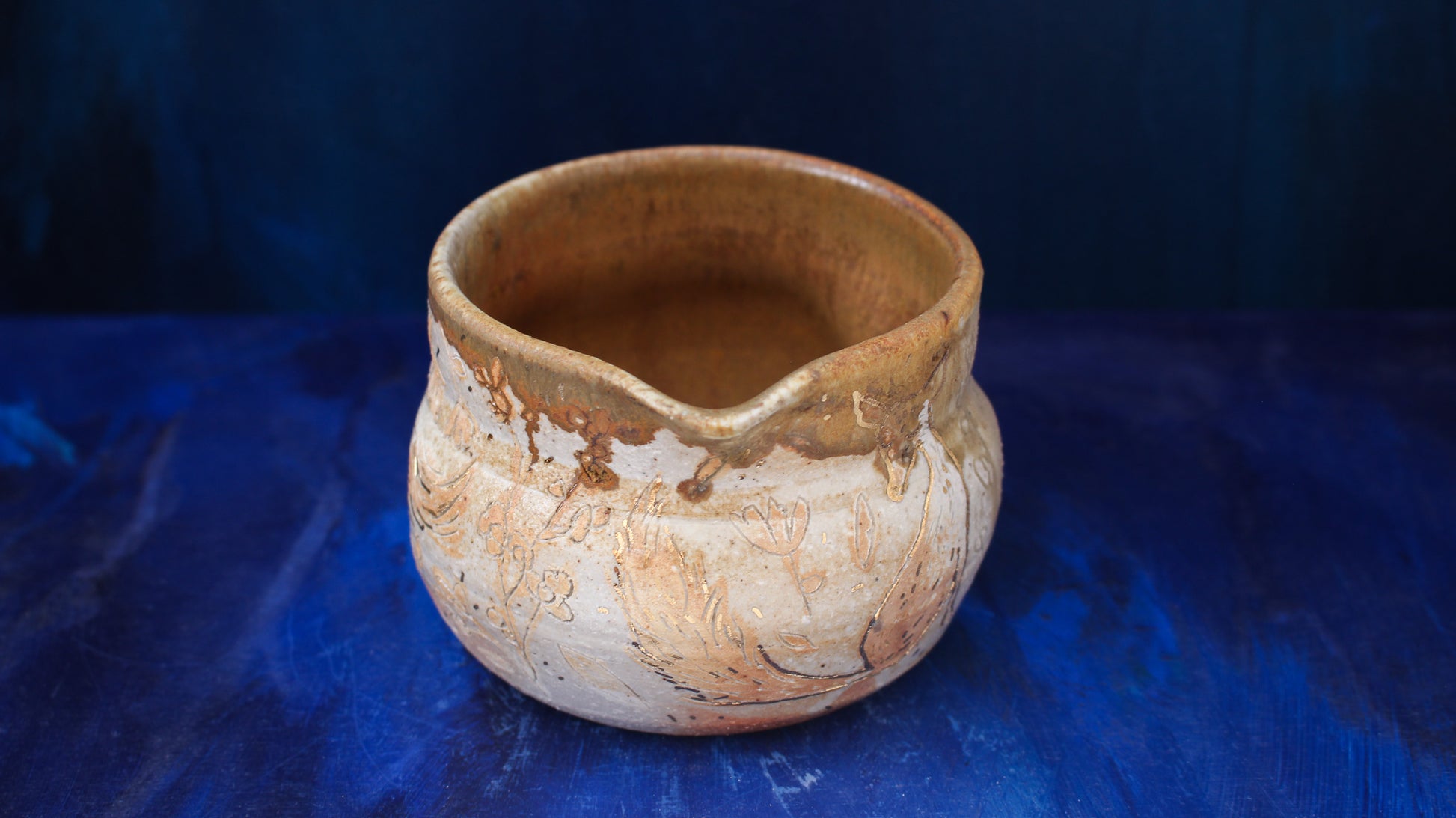 This pitcher is individually thrown, painted, carved, glazed & embellished with gold luster from start to finish as a one of a kind piece. It is fired in a wood fired kiln which creates unrepeatable results every time, caused by the wood ash, flashing of the flame & reduction atmosphere.