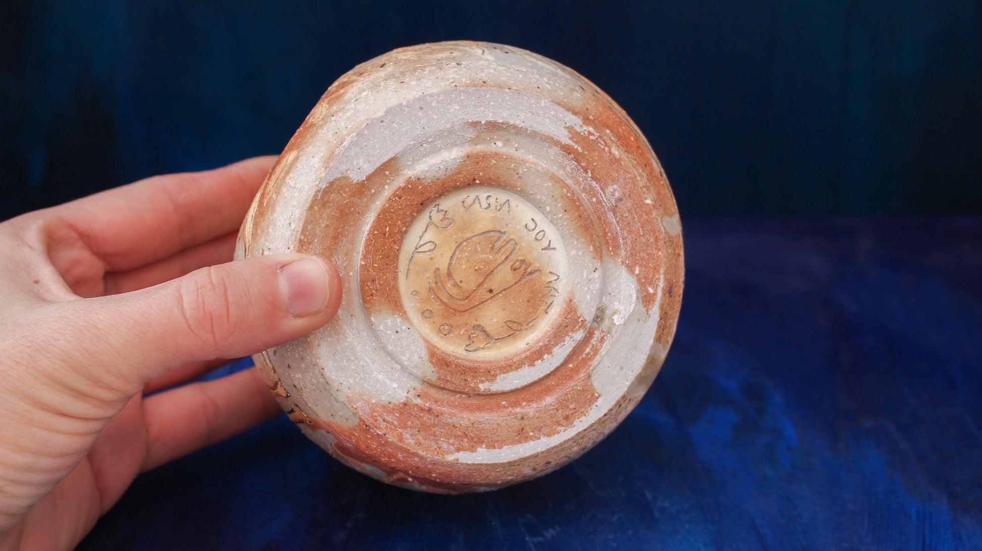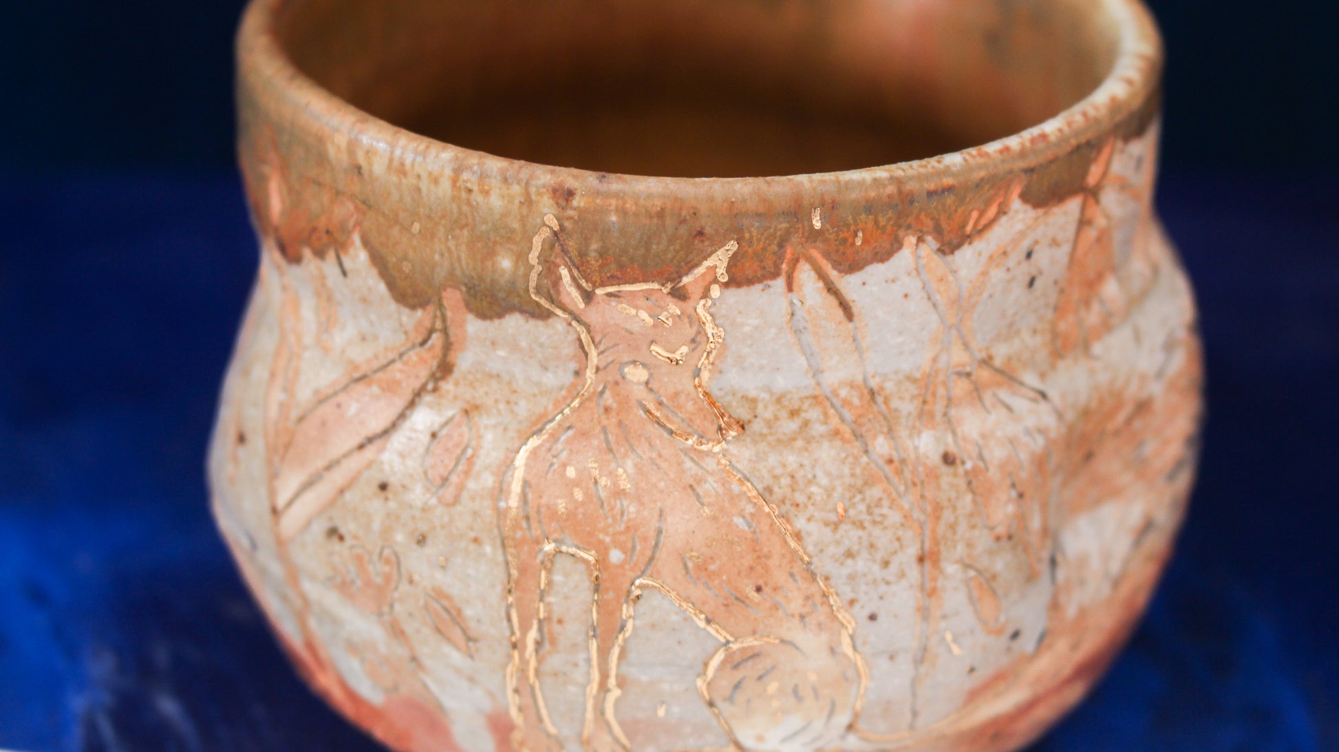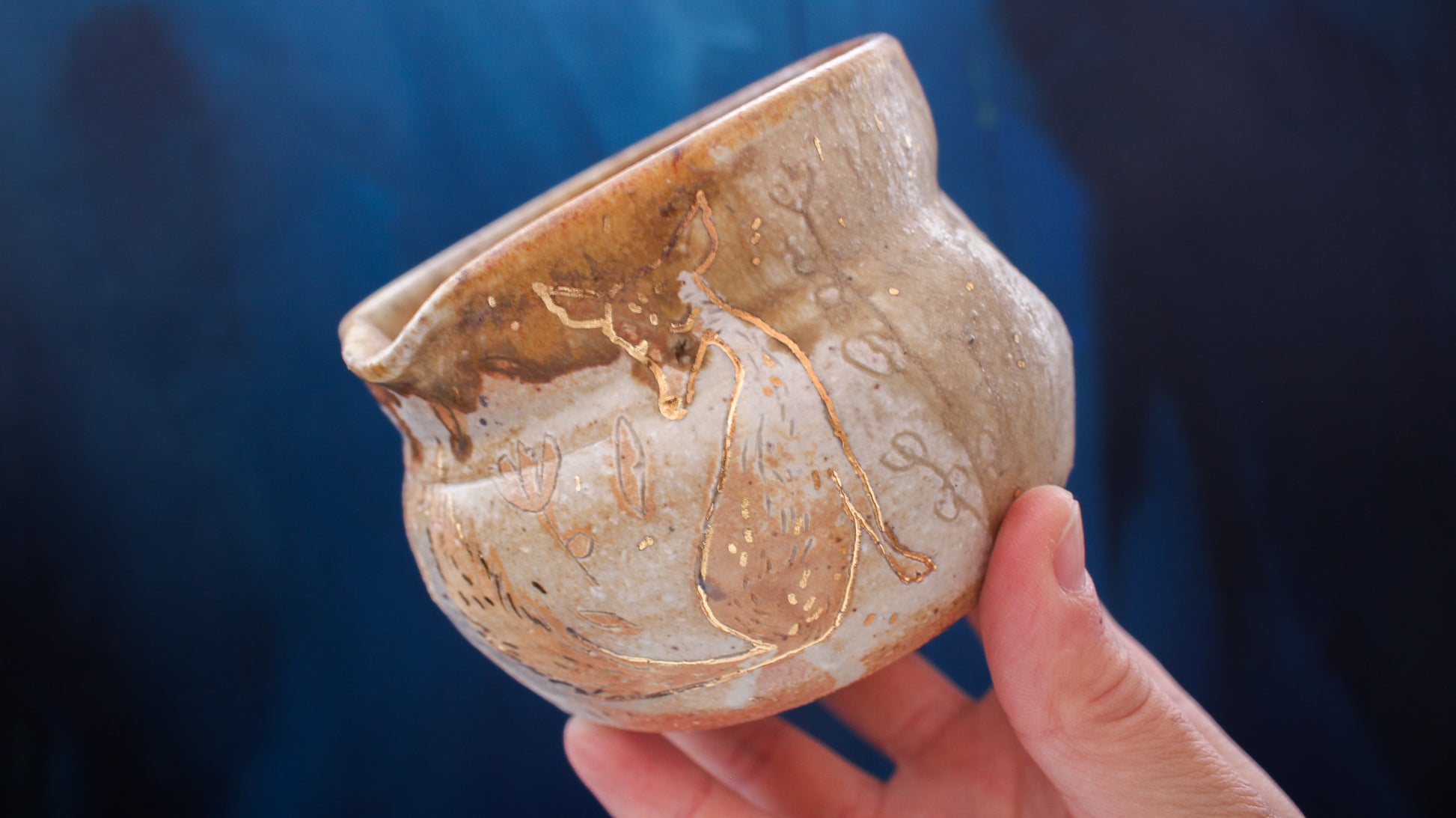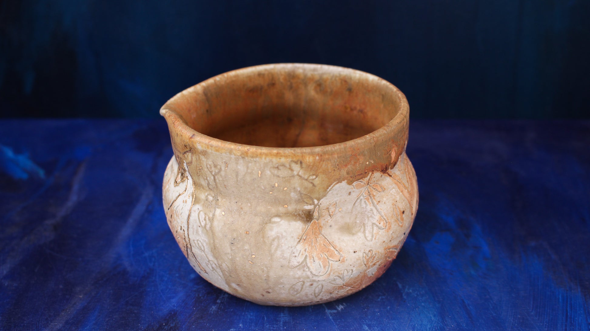 This pitcher is individually thrown, painted, carved, glazed & embellished with gold luster from start to finish as a one of a kind piece. It is fired in a wood fired kiln which creates unrepeatable results every time, caused by the wood ash, flashing of the flame & reduction atmosphere.