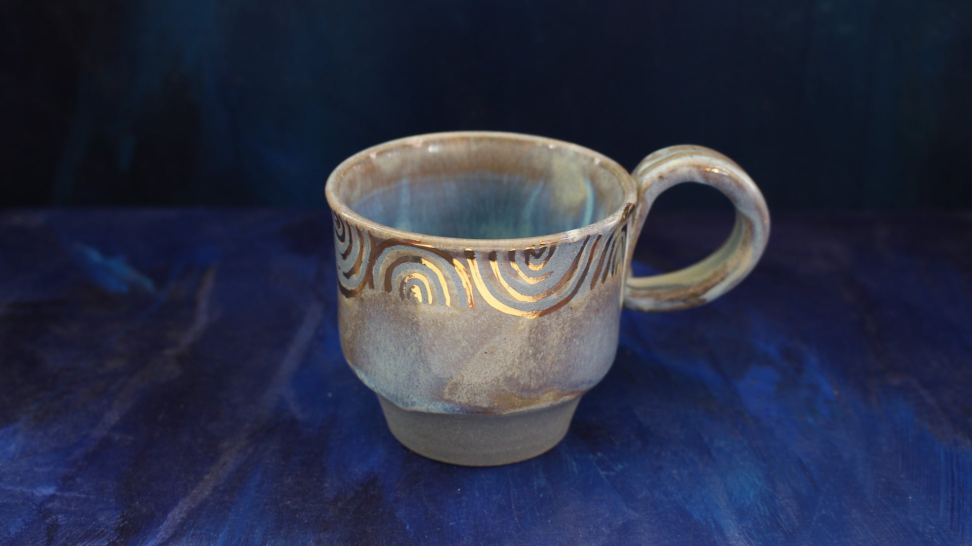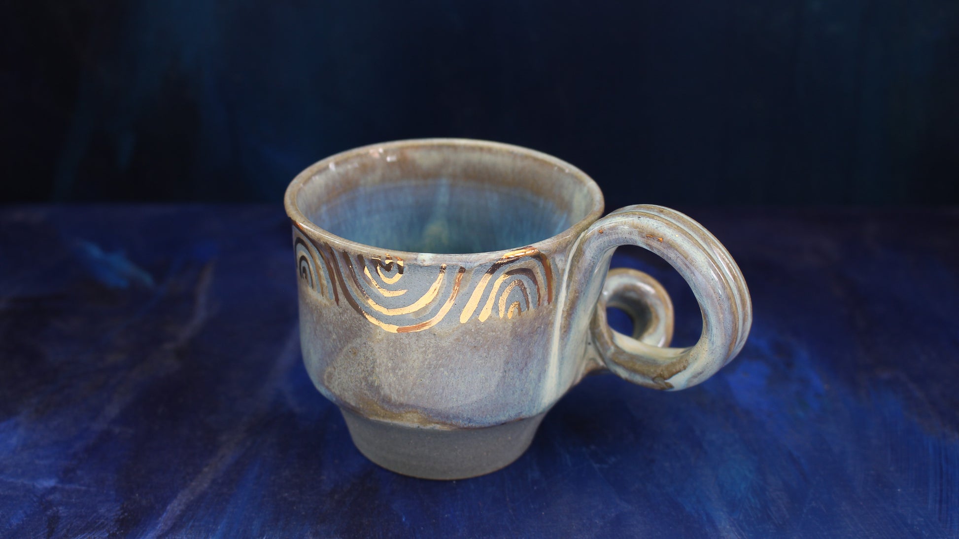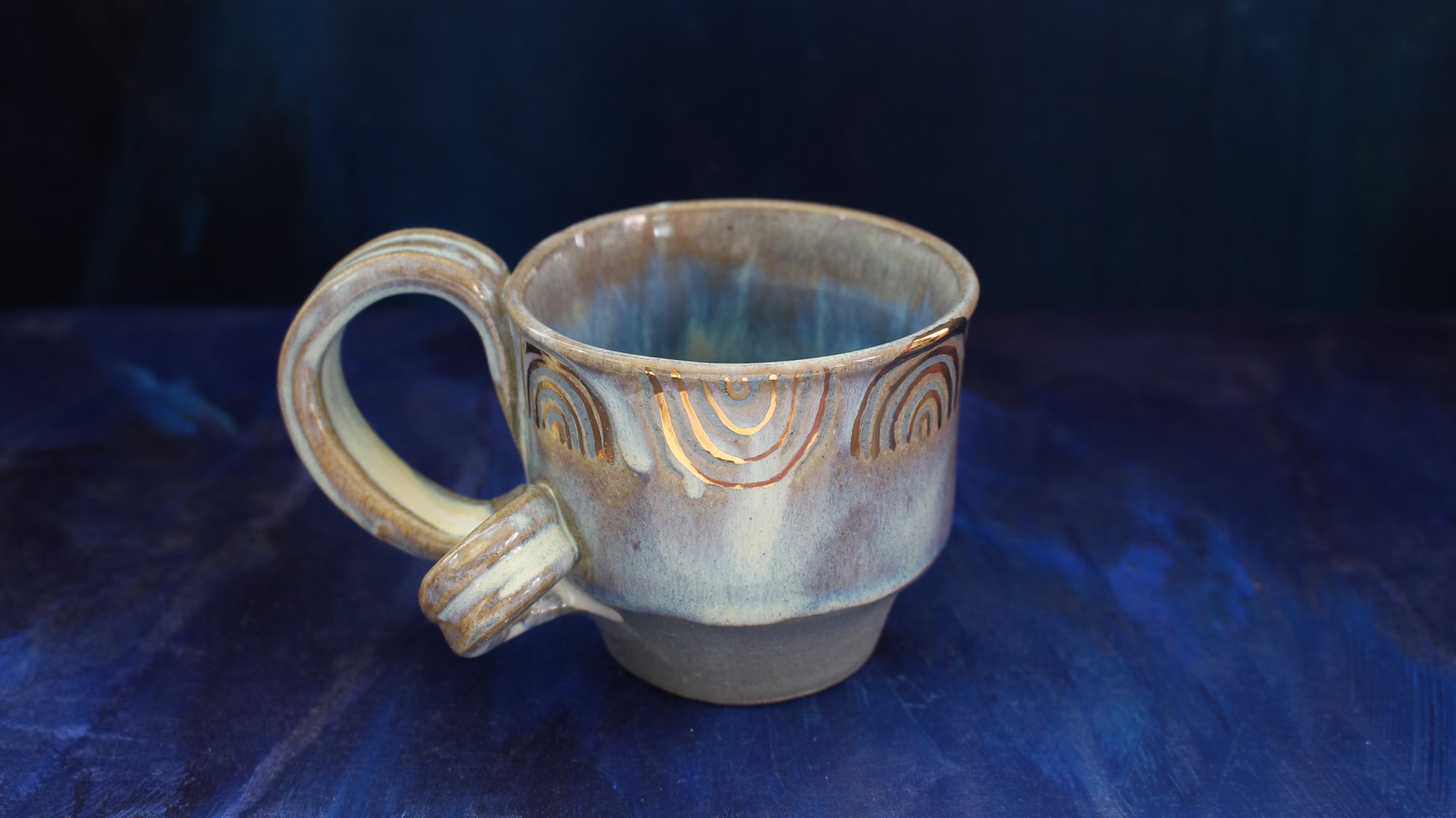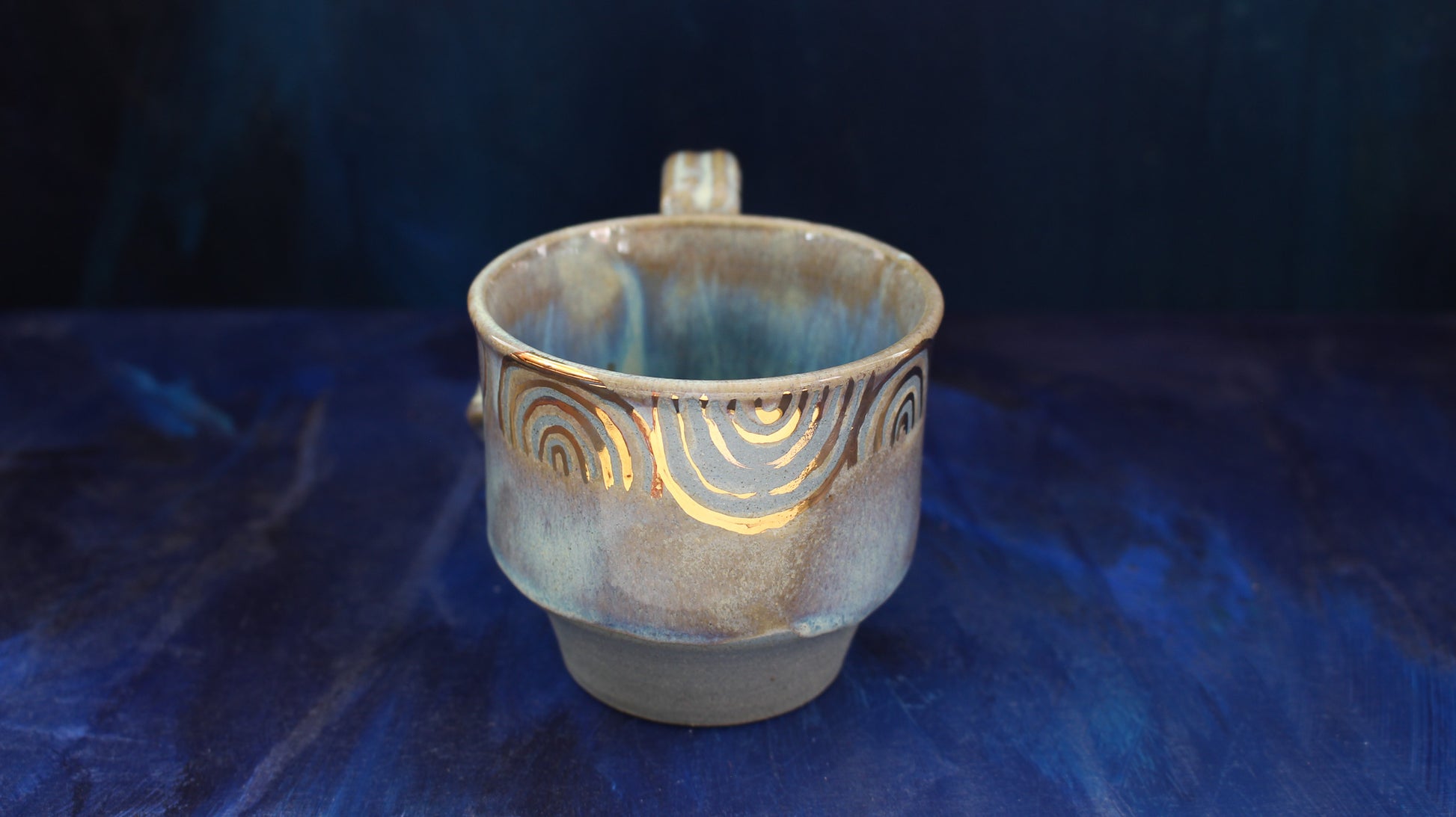 This stoneware mug is individually thrown, glazed & embellished with gold luster from start to finish.
