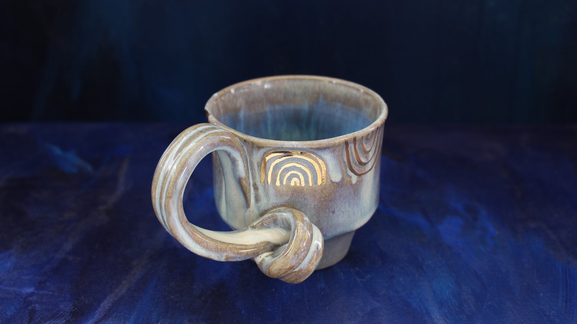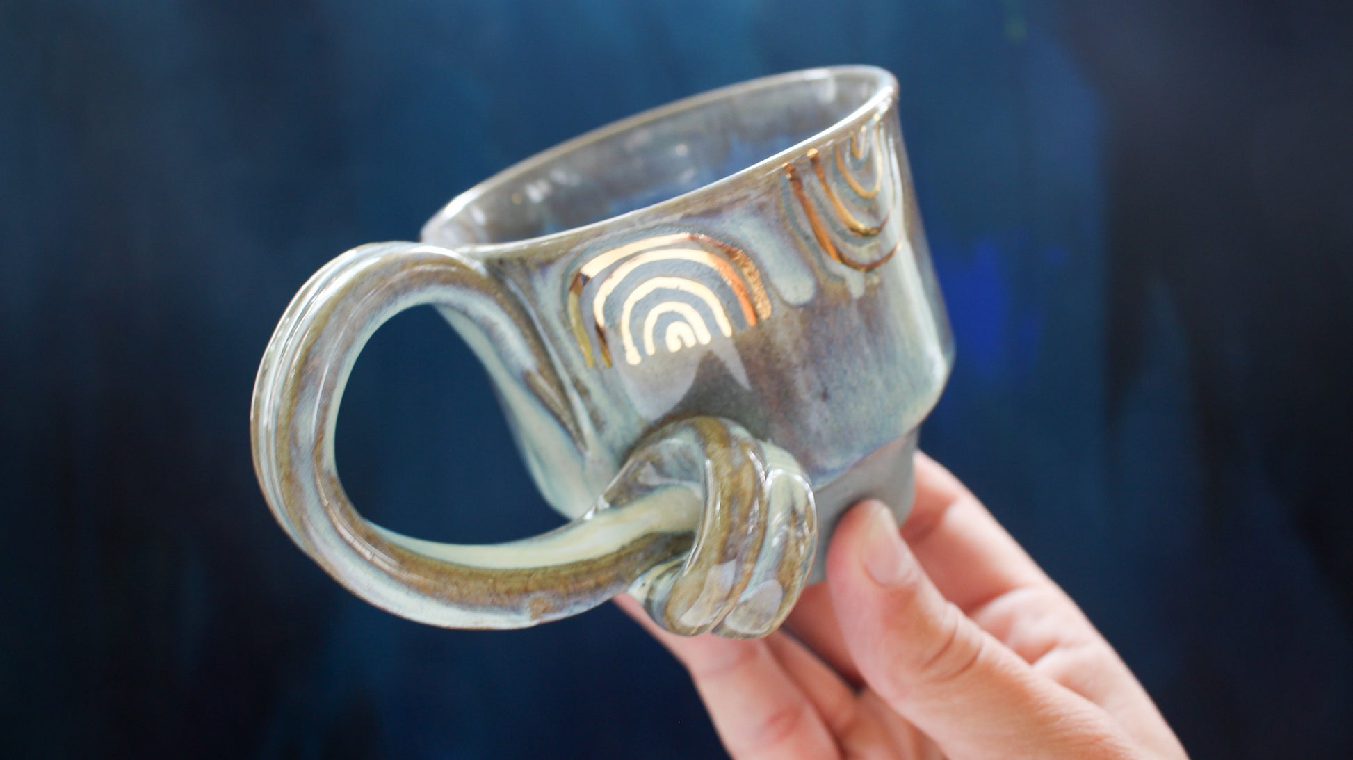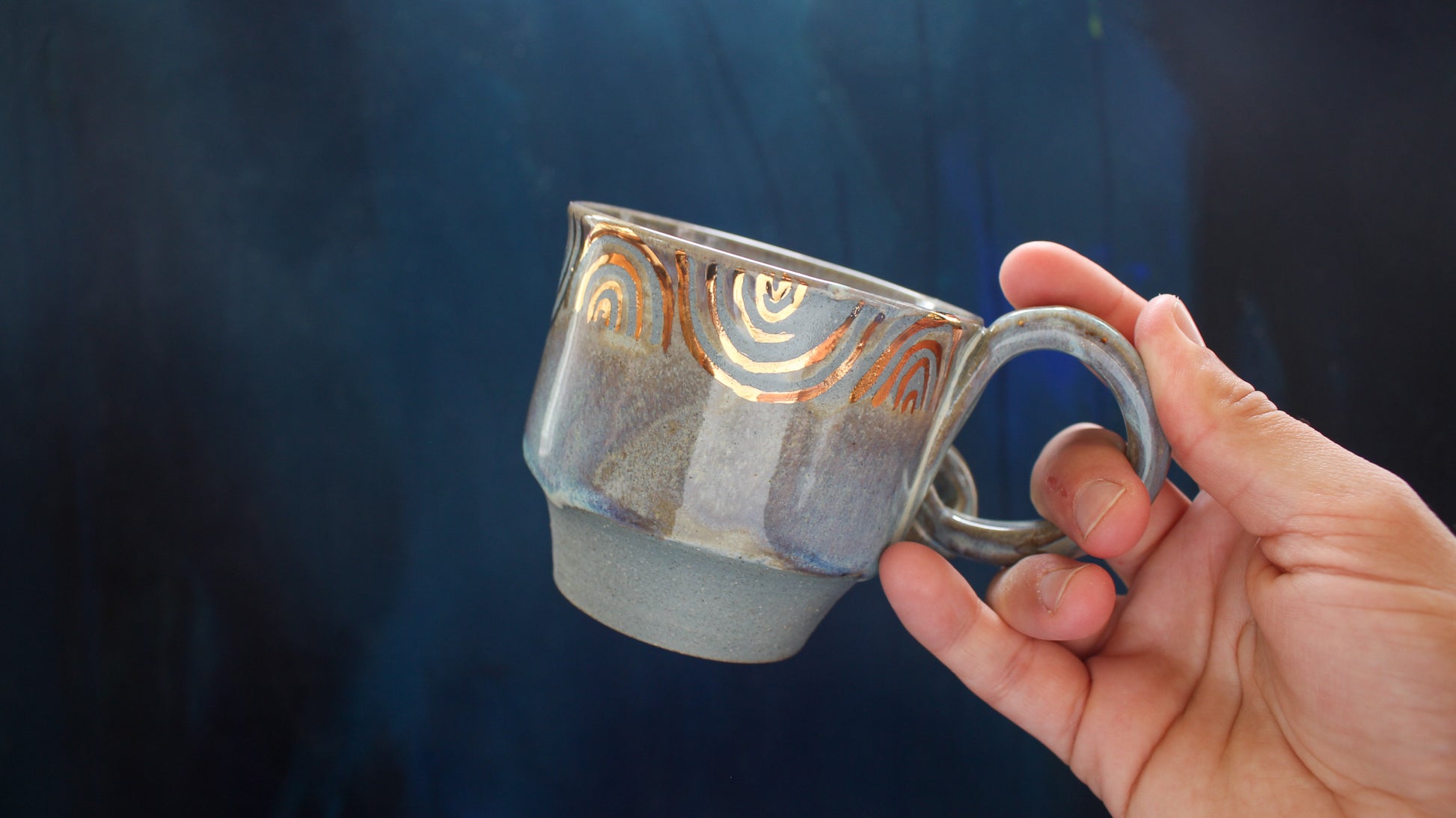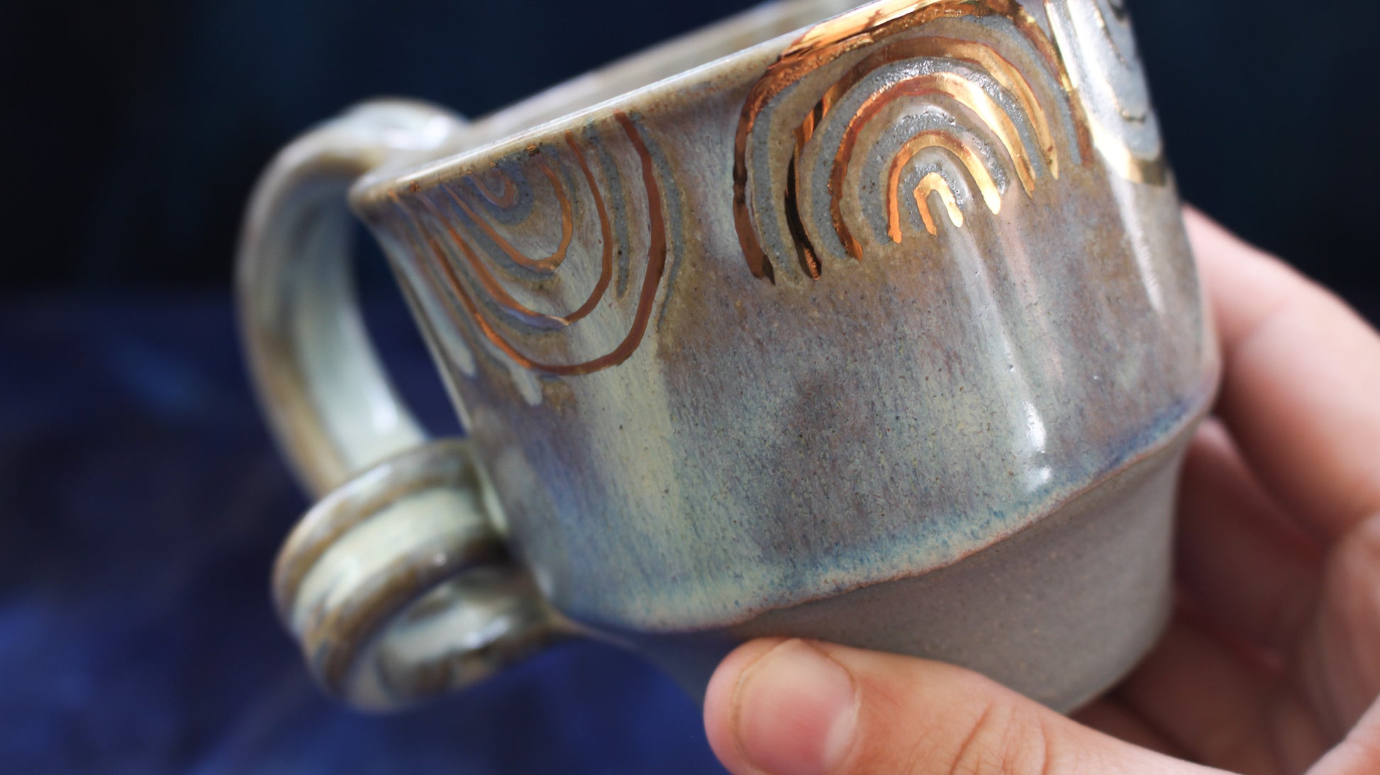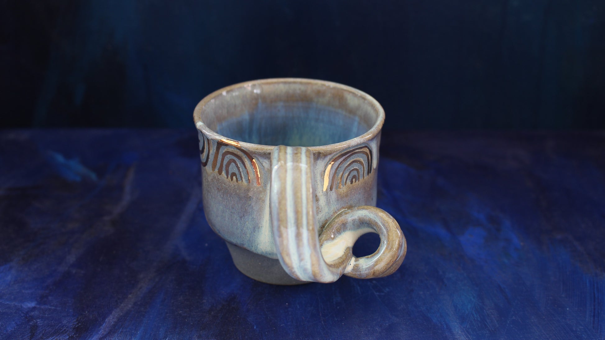 This stoneware mug is individually thrown, glazed & embellished with gold luster from start to finish.