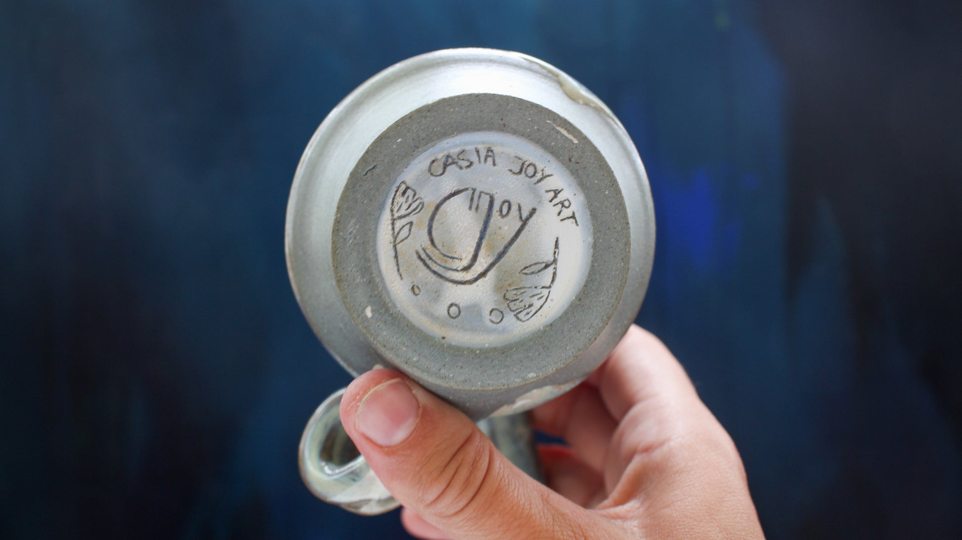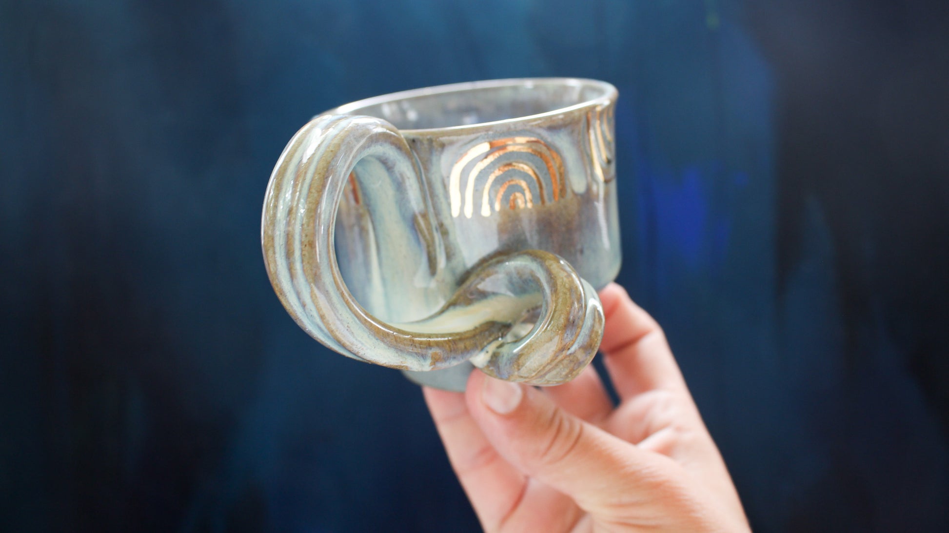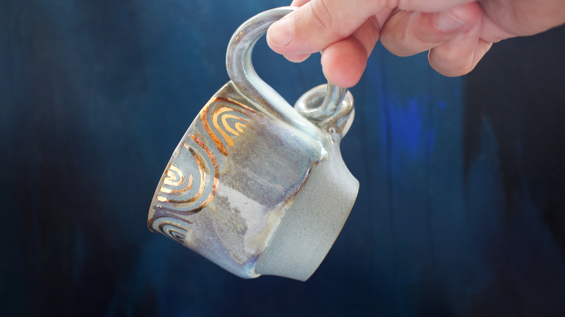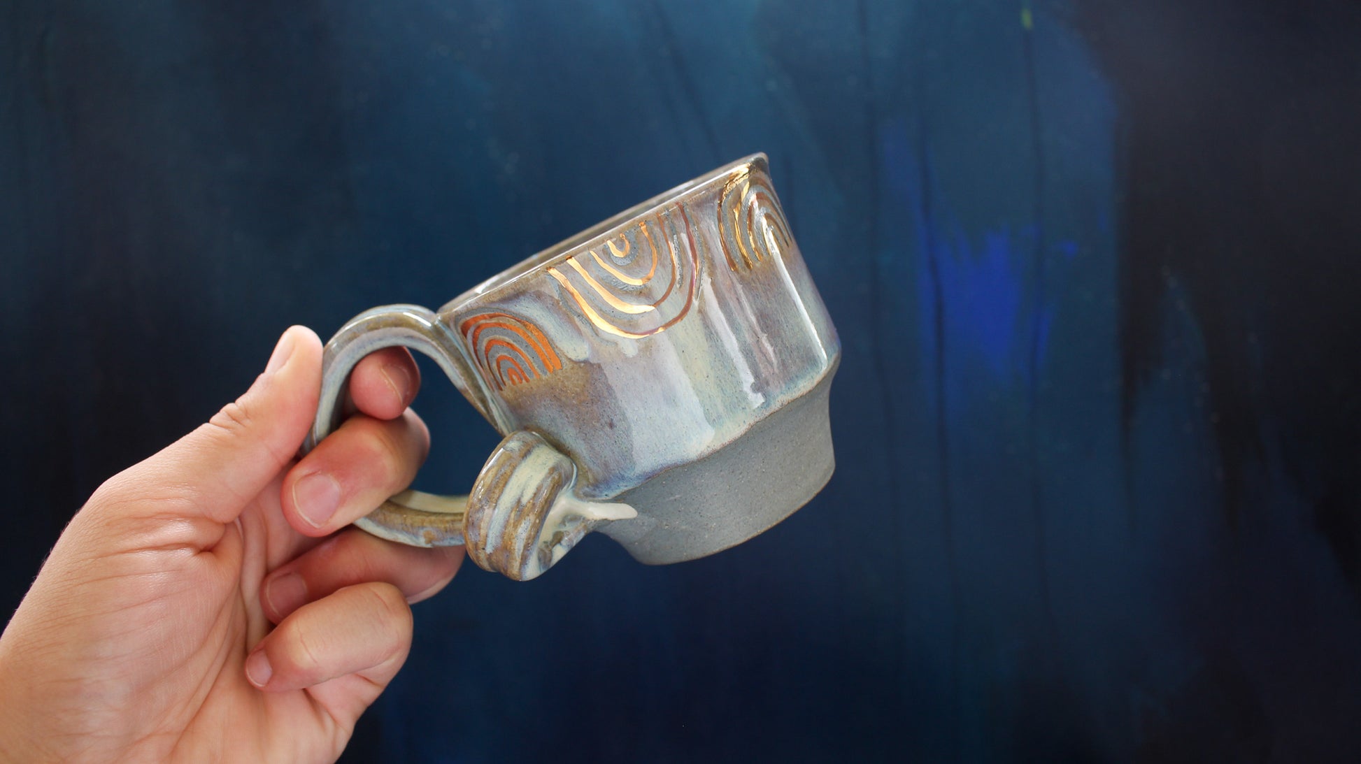 This stoneware mug is individually thrown, glazed & embellished with gold luster from start to finish.