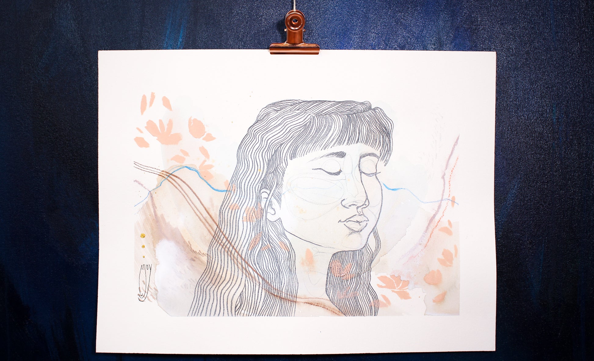 12"x16" Watercolor, Watercolor Pencil, Graphite Pencil, Dry Pastel, Ink, Gold Acrylic & Gouache on Arches 140 lb Cold Press Watercolor Paper