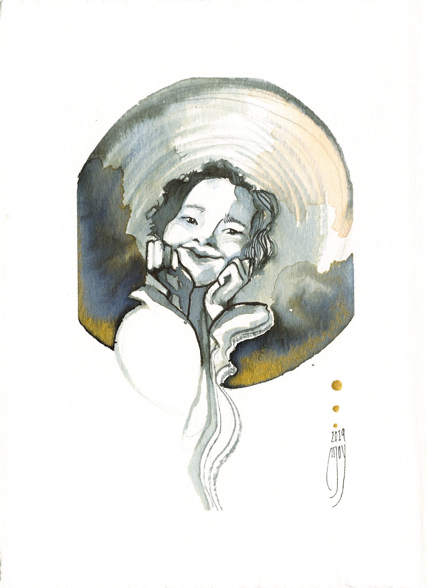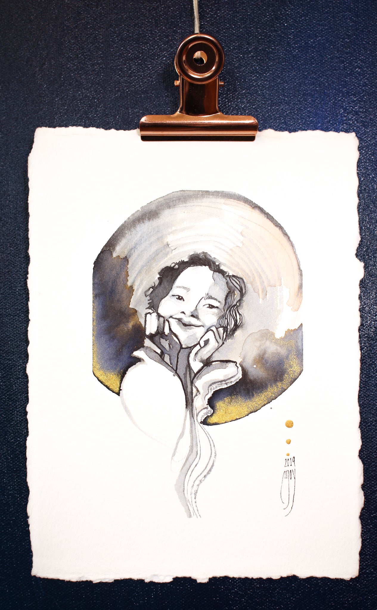 5.5" x 7.5" Ink & Gold Acrylic on Arches 140lb Cold Press Watercolor Paper with a Deckled Edge