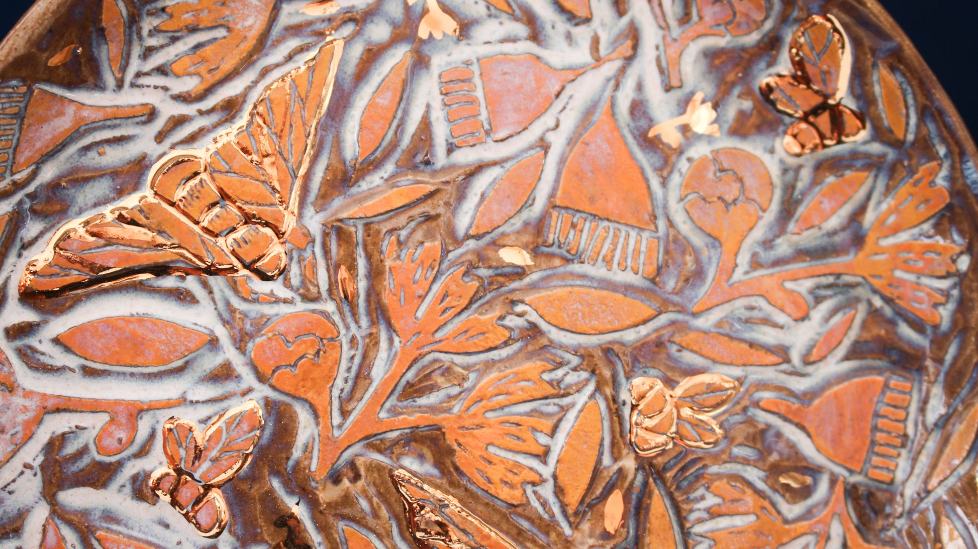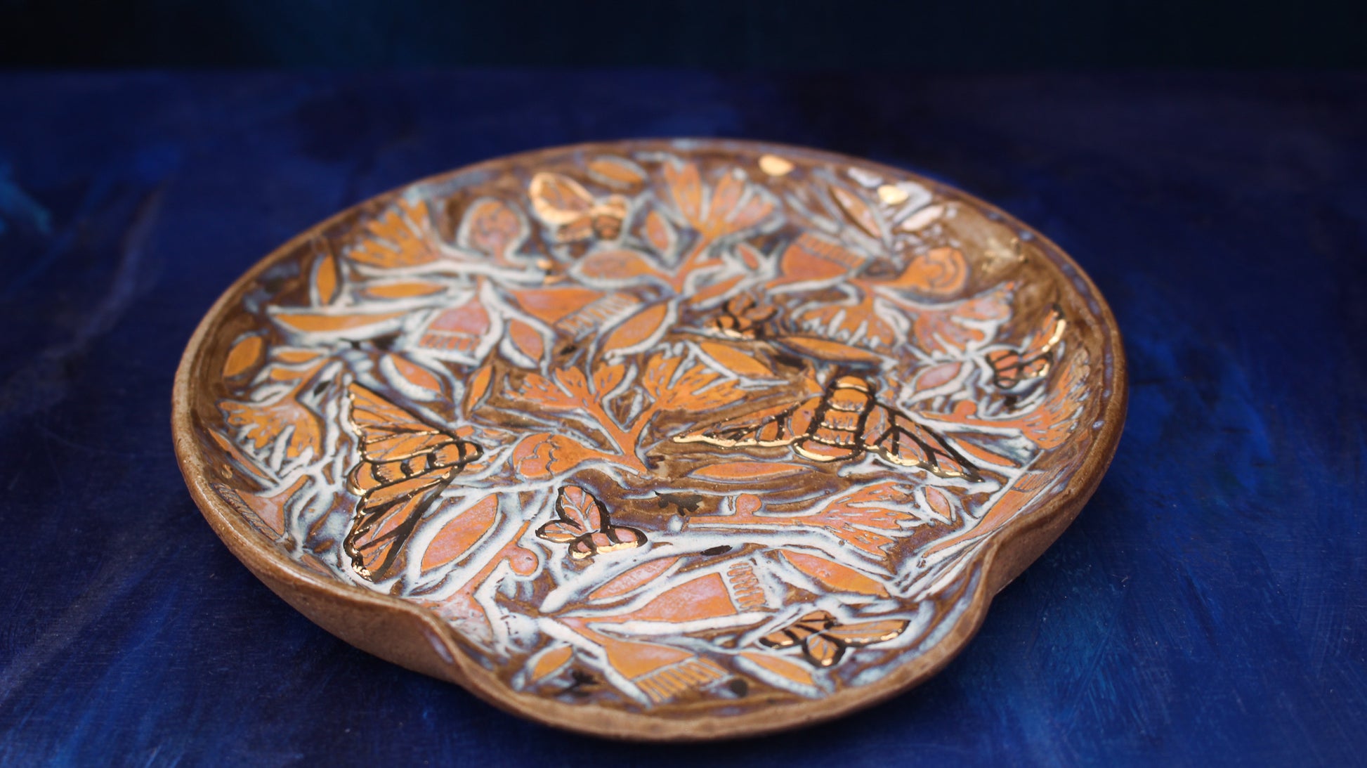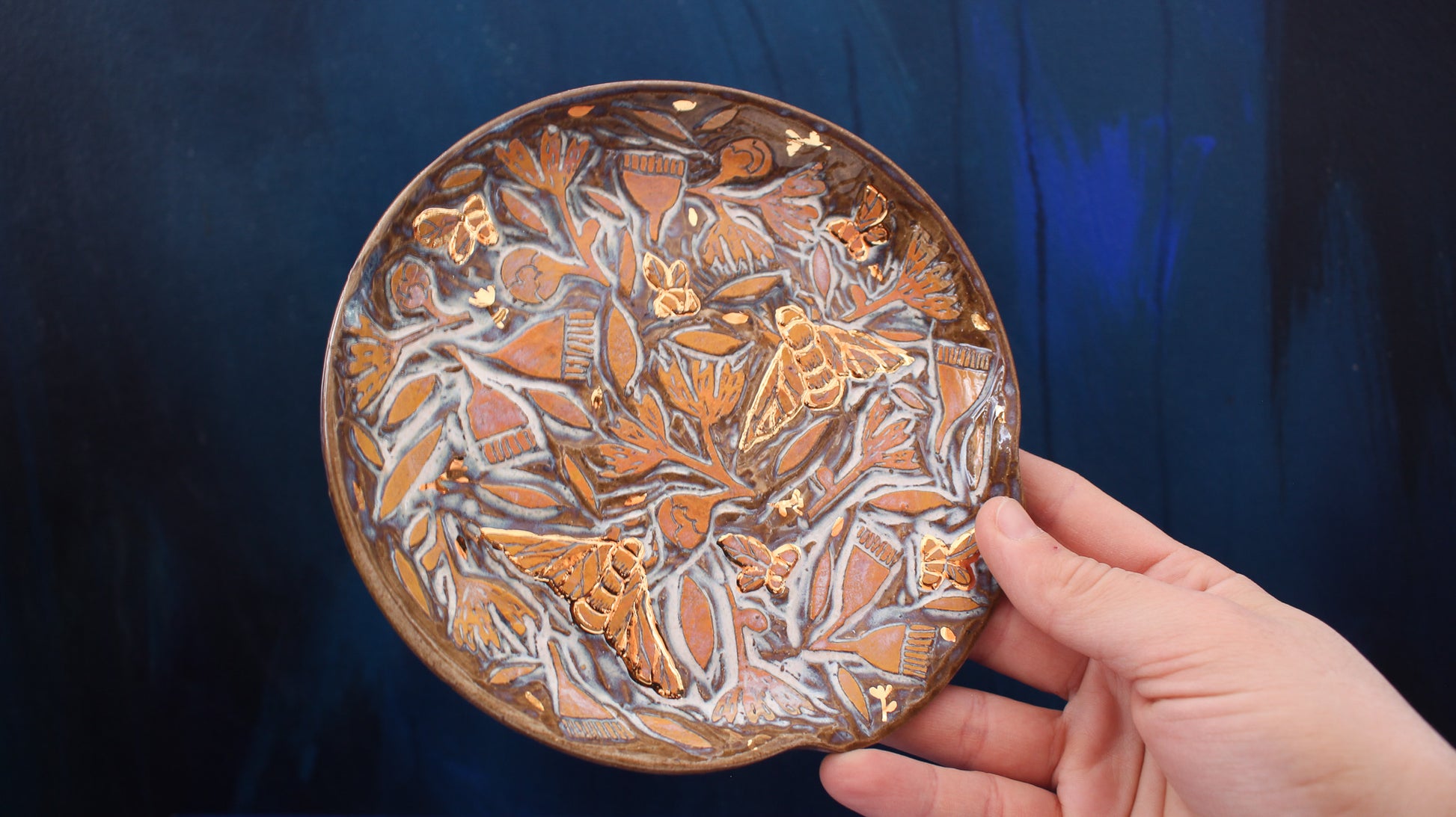 This stoneware spoon rest is individually thrown, painted, carved, glazed & embellished with gold luster from start to finish.