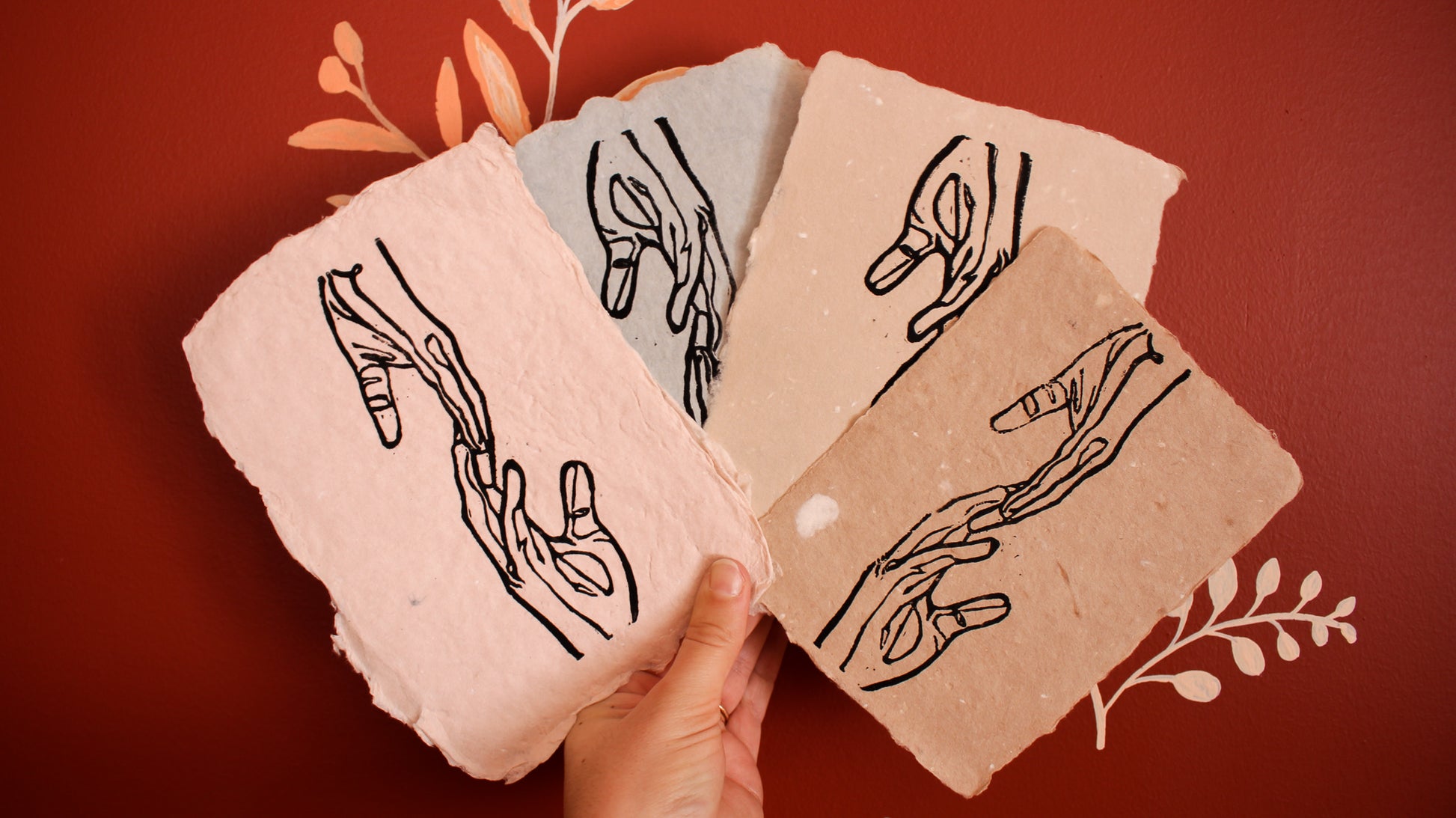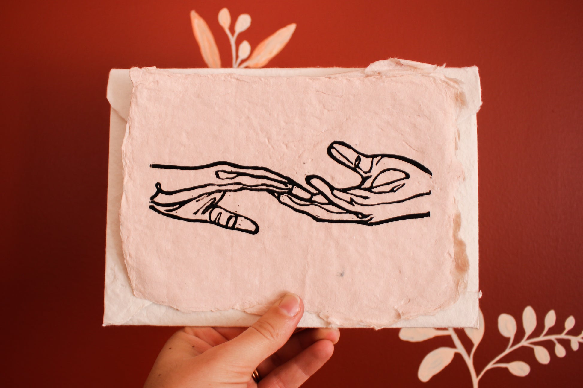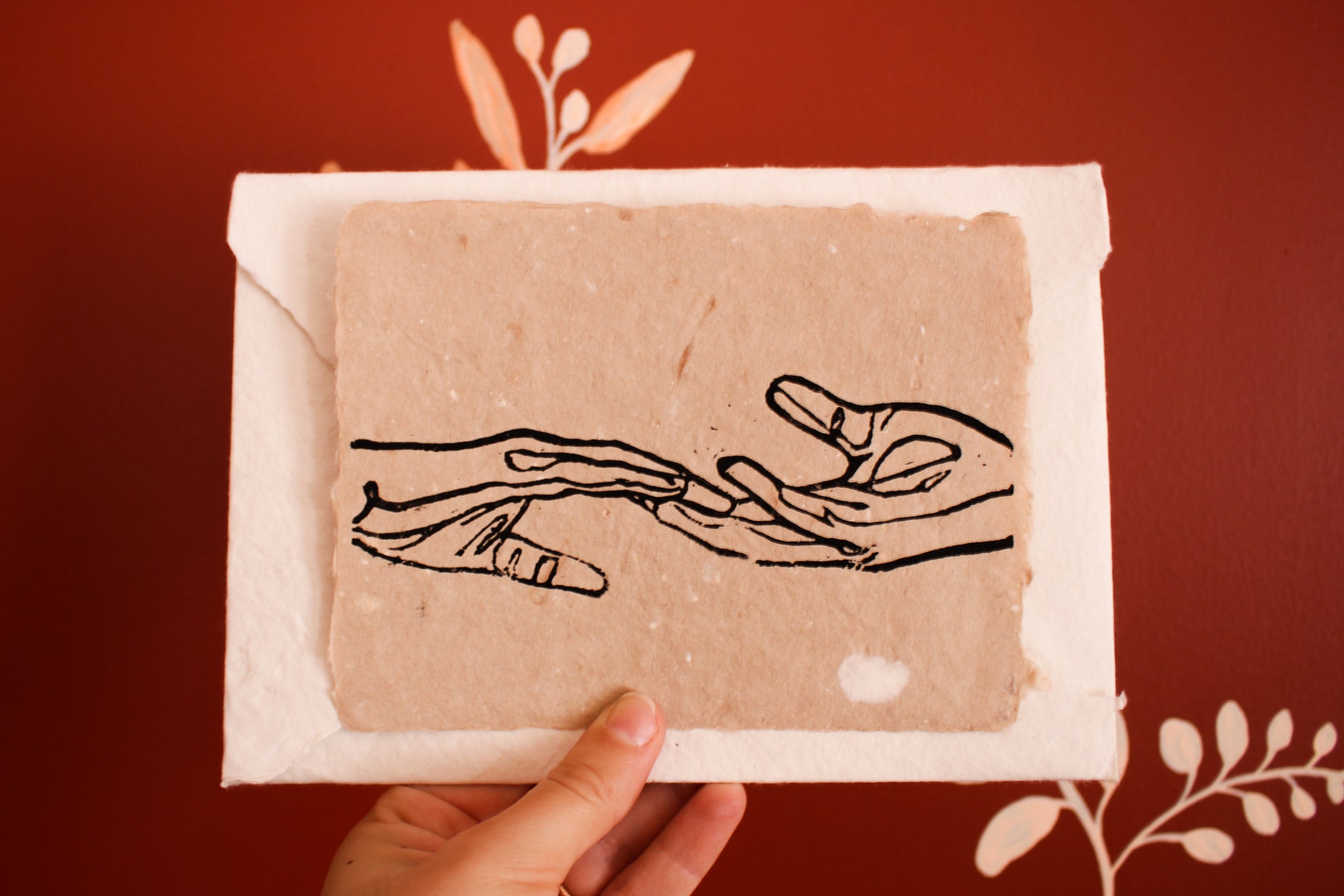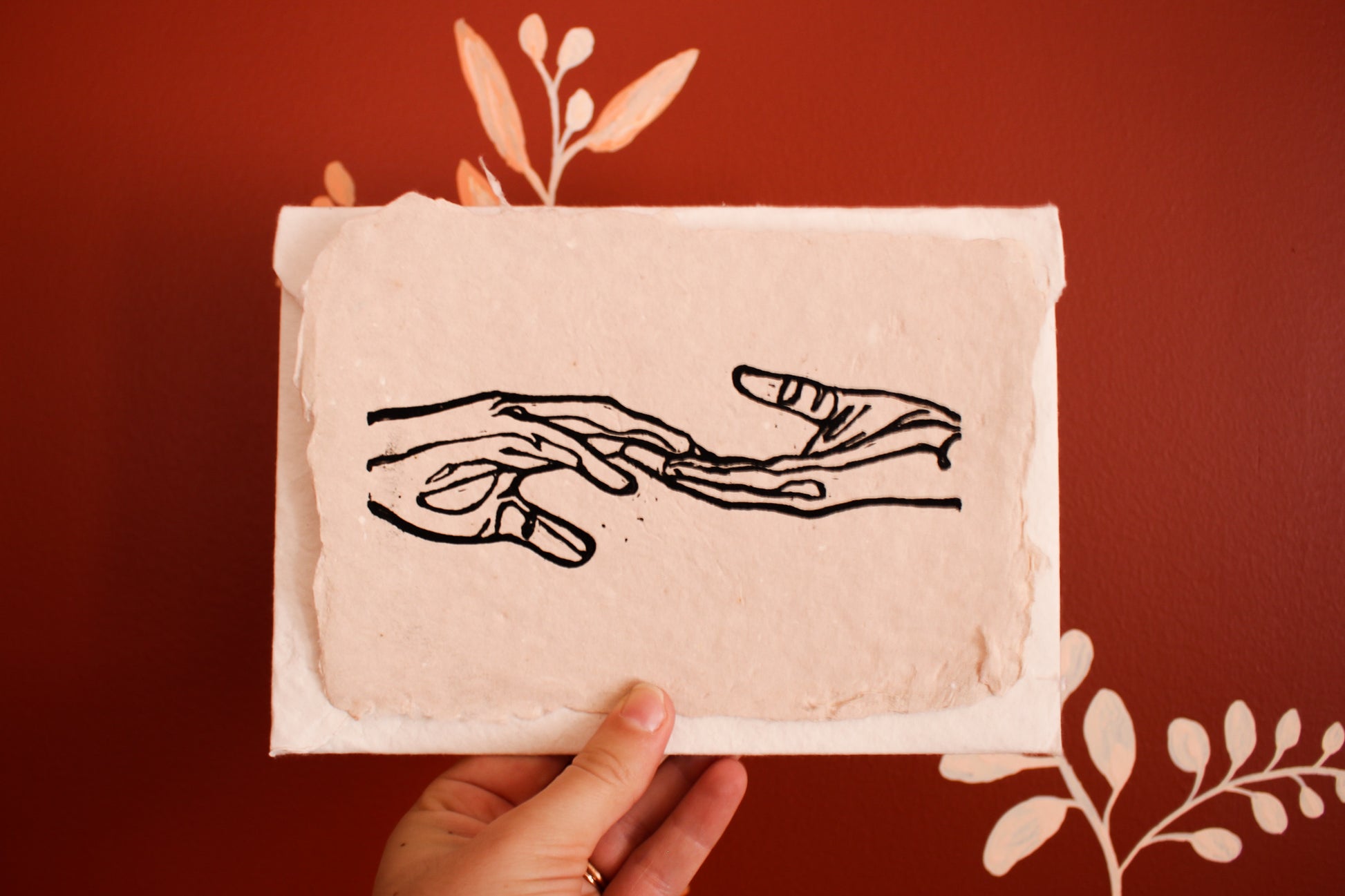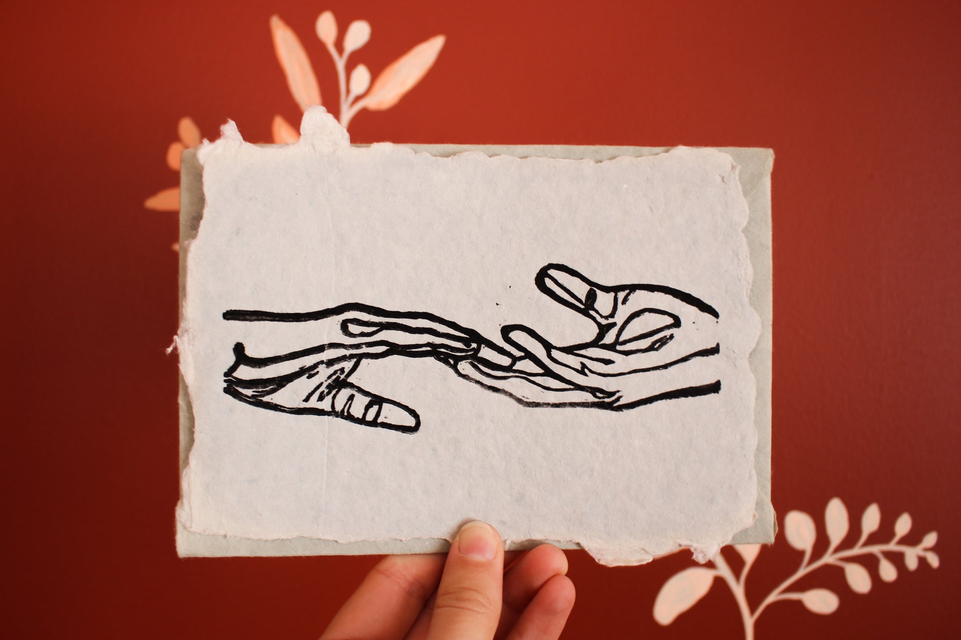 1 - Handcarved "Hand to Hold" Lino cut print, with black relief ink on Farmette Handmade Paper