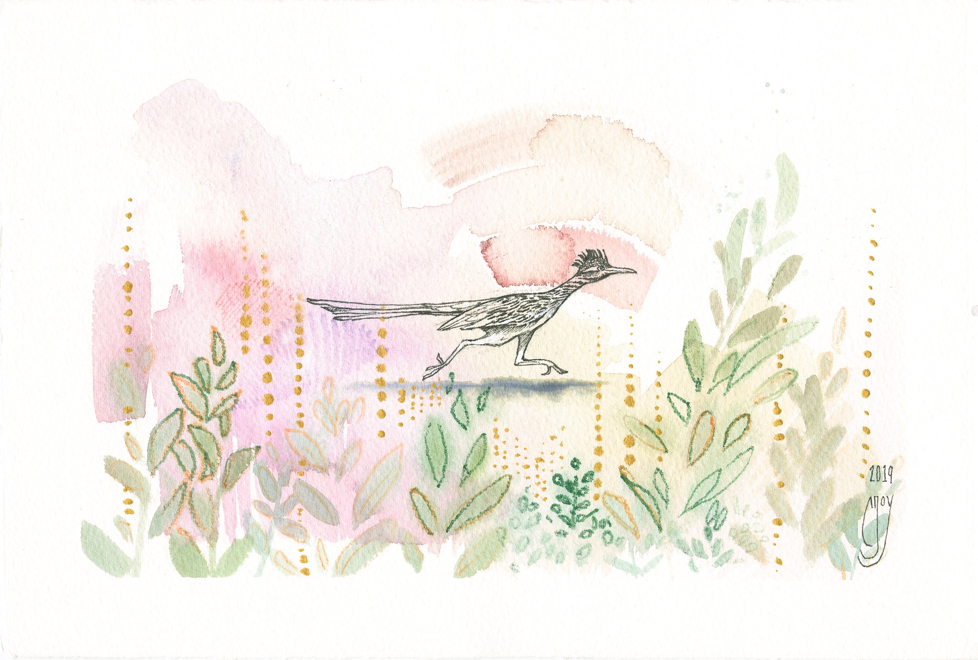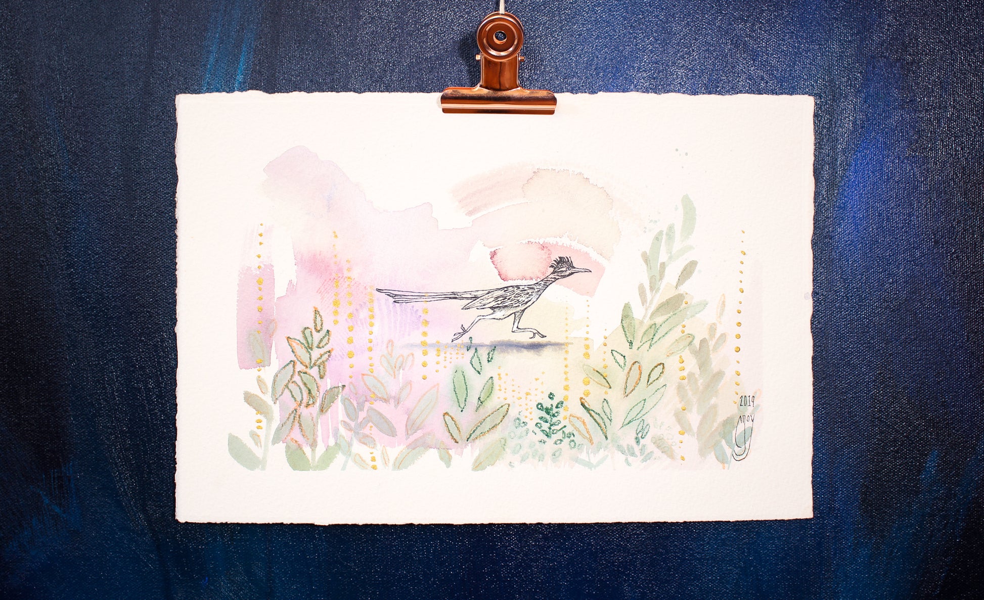 7.5”x11.25" Watercolor, Watercolor Pencils, Ink Pen, Ink, Dry Pastel & Gold Acrylic on Arches 140 lb Cold Press Watercolor Paper with a Deckled Edge