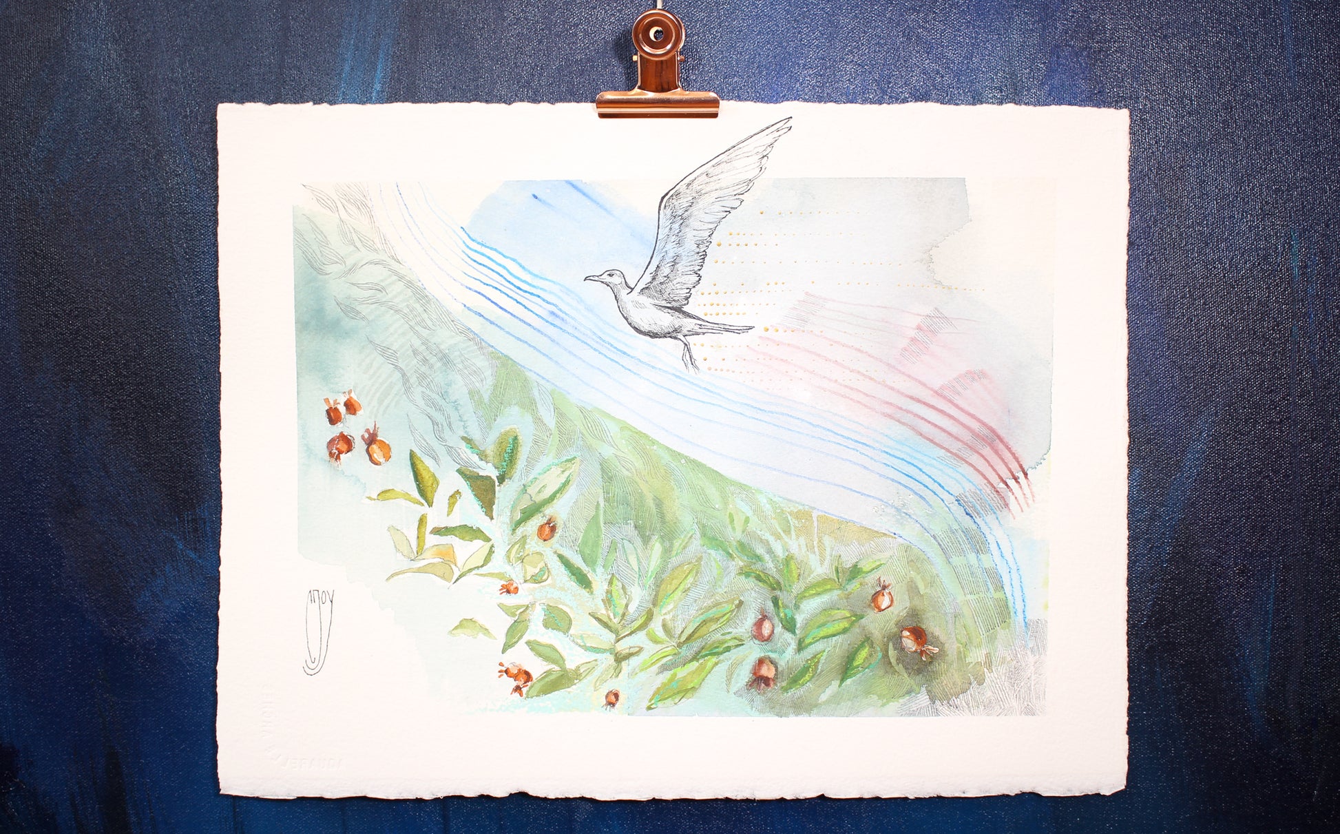 11"x15" Watercolor, Watercolor Pencil, Dry Pastel, Graphite Pencil, Gold Acrylic & Ink Pen on Arches 300 lb Cold Press Watercolor Paper with a Deckled Edge