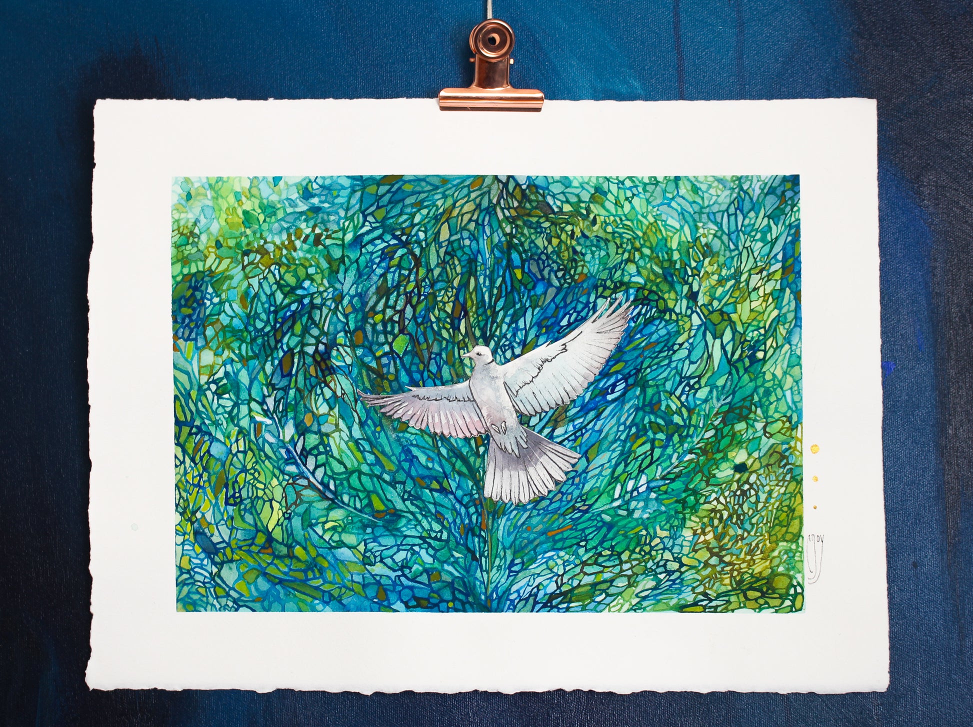11"x15" Collaged Paper, Watercolor, Watercolor Pencil, Dry Pastel, Ink pen, Gold Acrylic & Acrylic Ink on Arches 140 lb Cold Press Watercolor Paper with a Deckled Edge